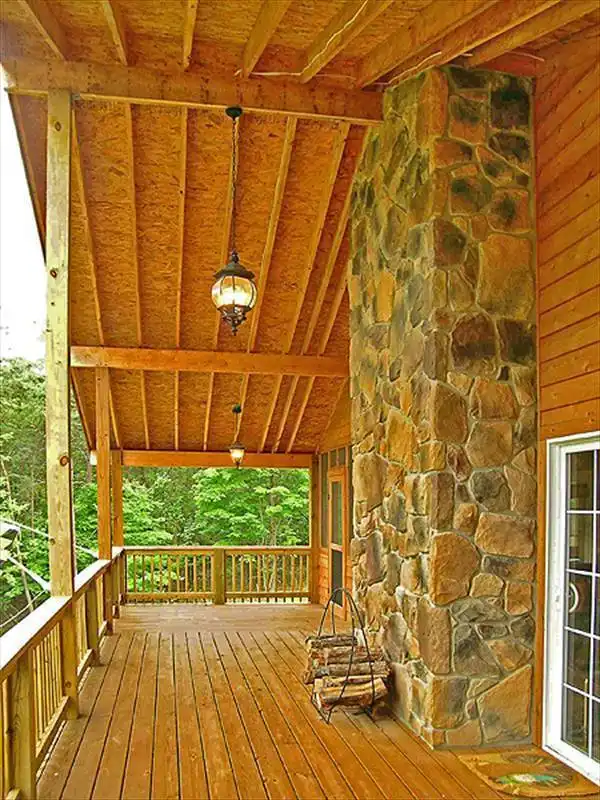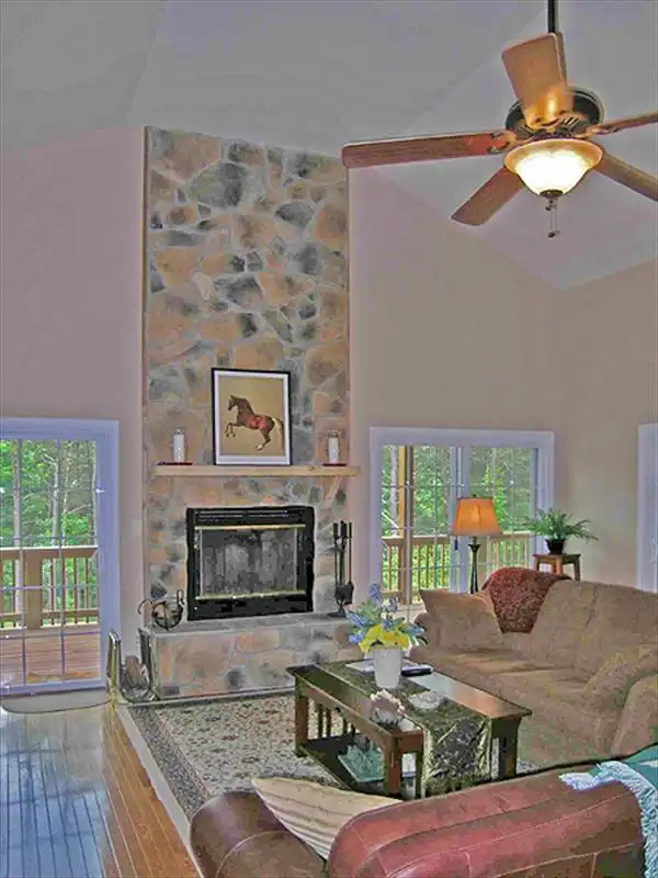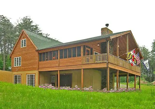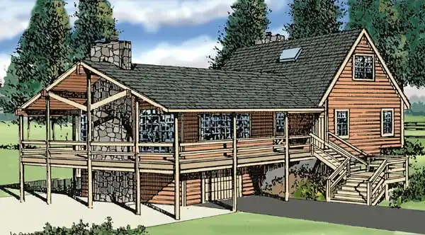 This rustic multi-level cabin offers the flexibility of an optional walk-out basement for building on a sloping lot; it adds 545 sq feet of living space, but may be omitted if you have a level lot. A massive country kitchen and Great Room, each with a fireplace, share the main level with the master bedroom; an impressive deck wraps the Great Room, accessible from sliding glass doors on three sides. Two additional bedrooms are located on the upper level; a rec room with fireplace and sliders to an outdoor patio and a garage or boat storage area are found in the optional lower level.
