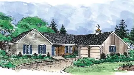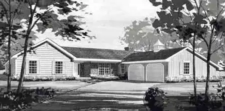 The L-ranch has been an old favorite; it requires less lot width and also adapts to sloping lots. A variety of siding materials blend together for a classic country look in this design. A dramatic sunken living room with bay window-wall is the view that greets arriving guests. A front-facing dining room completes the formal living area. The family room with fireplace is open to the kitchen and breakfast bay for informal family shared time. Three bedrooms and two full baths make up the sleeping wing of the home