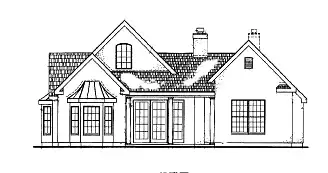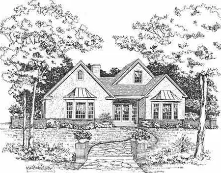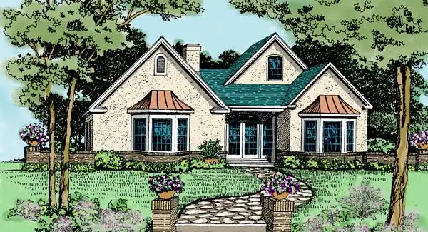 Regal metal-roofed bays give a European flair to this captivating cottage design. I designed it in an H-shape, with front and rear courtyards and porches. The center of the design is a spectacular great room which features a 19-ft. vaulted ceiling stretching from front to rear.The same ceiling extends over the bayed dining room. Features here include a fireplace and sliding glass doors to the covered porch. An angled door leads to the secluded master bedroom, with its private access to the backyard. Two closets and a whirlpool bath complete the suite.
