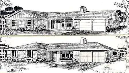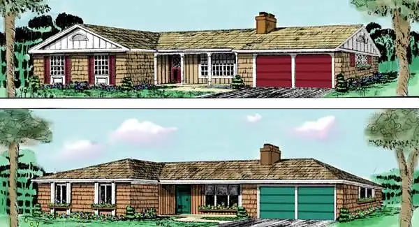 Life will be grand as you enjoy the inside and out of this contemporary three bedroom ranch-style home! It lives larger than it's practical size due to an extremely efficient floor plan that doesn't waste a square inch yet is extremely furnishable. You can build it either with a gable roof or hip roof as shown. The living room overlooks the covered porch and flows to the sunny, breakfast nook with bay windows. You'll love the warmth of the family room fireplace and the convenience of the galley-shaped kitchen. The private master suite offers a spacious walk-in closet and a master half-bath.