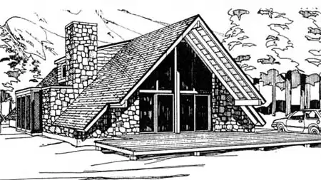 This A-frame includes the dramatic interior common to true A-frames. The great room features a spectacular two story high ceiling ,which extends over the dramatic second floor balcony adjacent the private master suite. Outdoor porches and decks contribute to the great liveability of this plan.
