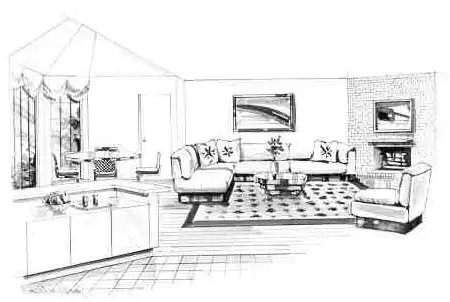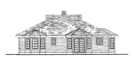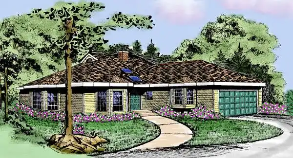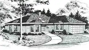 Eye-catching angles, both inside and out, are the keynotes of this dramatic one-story home, which was designed to fit on a narrow lot. The striking double-door entry is illuminated by a skylight. The foyer is just as impressive, with its cathedral ceiling and skylight. The sunken living room also features a cathedral ceiling, and a bay-window alcove faces the front. A low partition separates the living room from the formal dining room. Here, too, a cathedral ceiling and bay windows add interesting angles and spaciousness to the room.