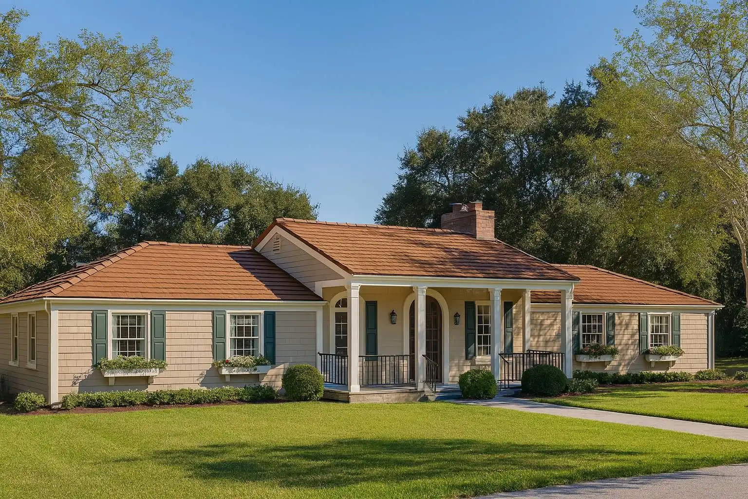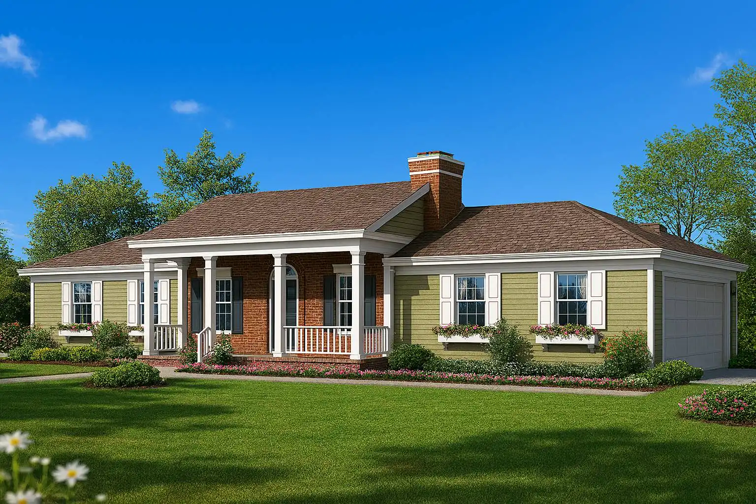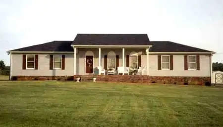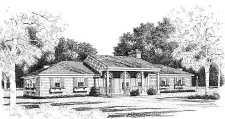 The hipped sides of this three tiered roof add a sense of formality to this practical three bedroom ranch. Columns outline this beautiful home's living room and dining room, adding to the feeling of elegance. The deck is cleverly designed to offer an outdoor retreat -- complete with a hot tub -- off the master suite. The master suite also includes a private bath, while two additional bedrooms and a full bath complete the sleeping wing.