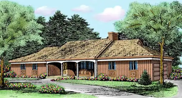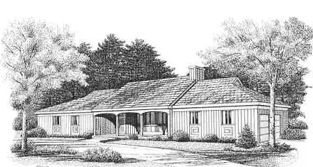 This style of ranch emphasizes a long, low roofline that imparts a ground-hugging contemporary appeal. This design, however also includes an extra deep front porch, more akin to a country style home.The interior features an open plan in the entertaining area. Note the beautiful bayed breakfast room.
