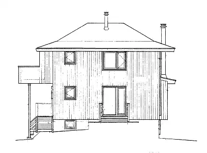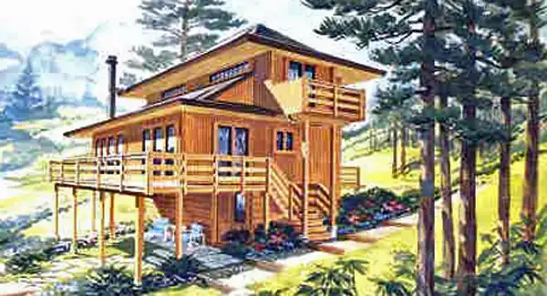 This stunning looking vacation home is perfectly suited to a sloping lot, paricularly for one that drops away from the road. The lowest level, which includes a private bedroom and bath, adapts the home to the slope. The main level includes dramatic entertaining rooms with a fireplace and vaulted ceiling. Two more bedrooms and a bath are located on the second floor. Decks to enjoy the outdoors are located on both upper levels.