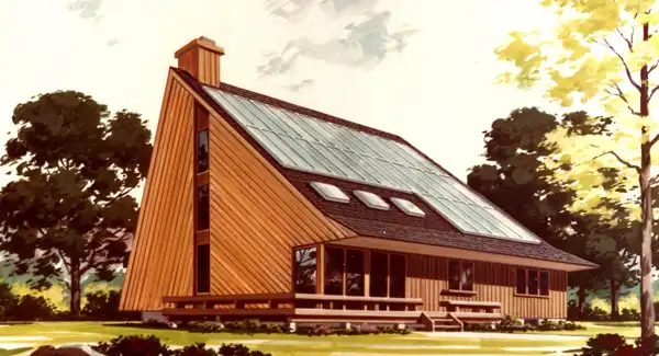 This dramatic contemporary two story is an exciting vacation styled home featuring up to three bedrooms and two full baths. The great room includes a fireplace and a soaring two-story ceiling. The second floor loft overlooks this dramatic space. The master bedroom could be located on either floor. Included in the plans are schematics for a solar collection system on the rear roof, which preferably should face south.