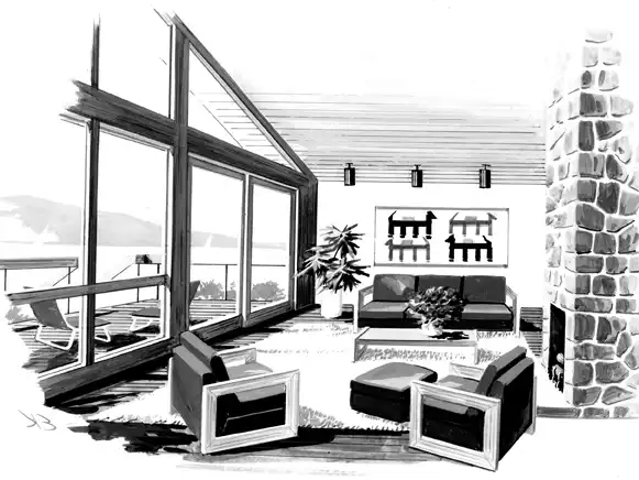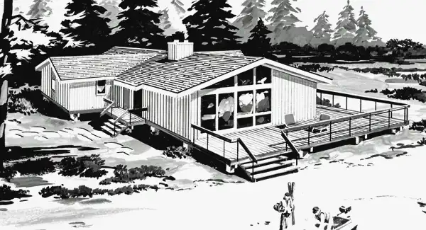 This contemporary beach or lake front vacation home is designed to be built in 4 stages if you so choose. When complete it provides for 4 bedrooms, two full baths and a great activity area. The kitchen features an outdoor serving counter to the rear deck. The great room has a soaring vaulted ceiling, a large fireplace and access to the three decks. Circulation is beautiful with very defined areas, leaving the home ideal for furnishing. Although designed on a pier foundation you could build it with a basement if desired.