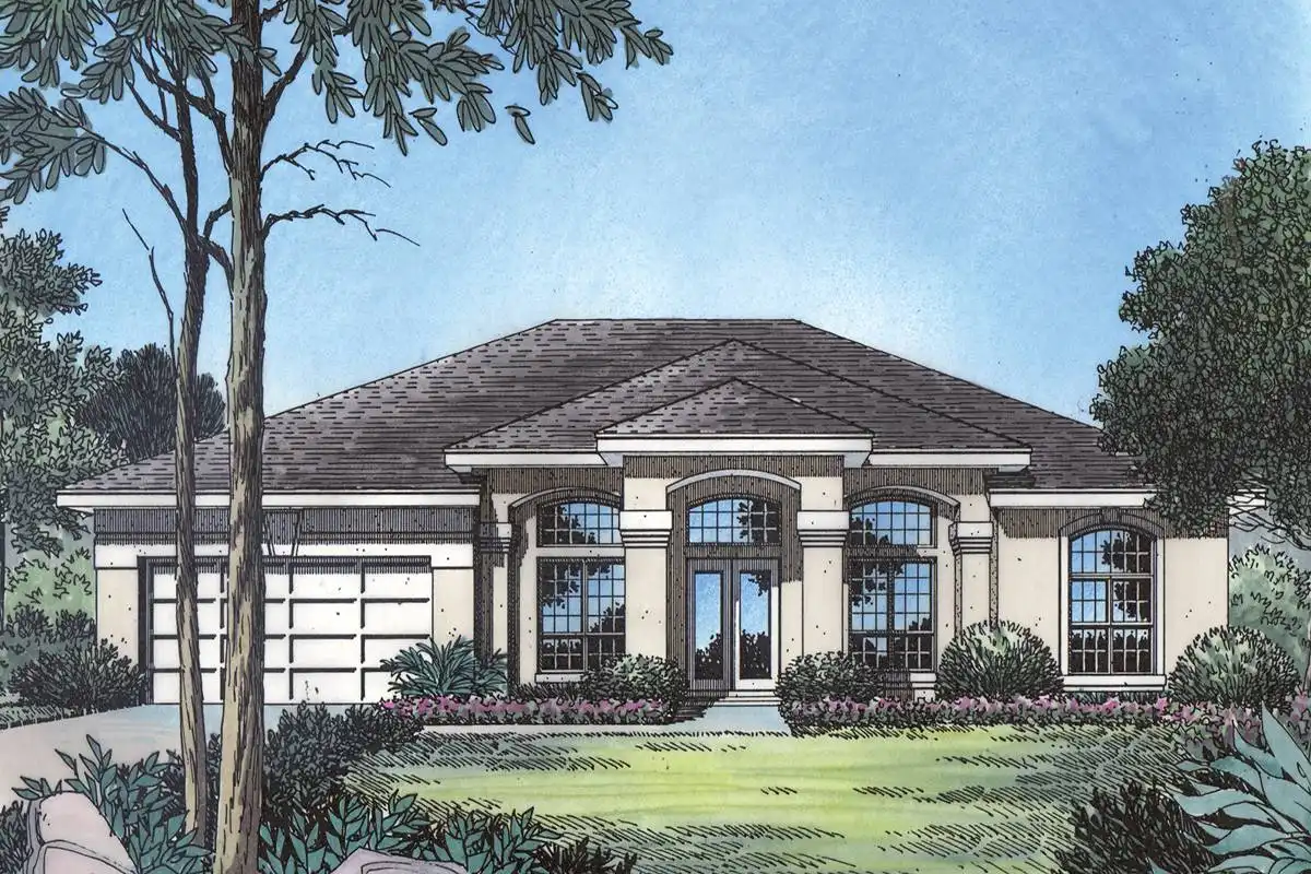 Tradition is brought back to house design with formal spaces. The second bedroom is great for overnight guests with it's private bath. Bedroom 4 can easily become home office/library with double doors that can open into living room. Mitered glass give the breakfast area an airy feel. Kitchen is a dream with walk in pantry and bar seating. Double doors open into master suite with grand bed wall, sumptuous bath with step down "doorless" shower. Elevation brings stately elegance through delicate stepped trim.