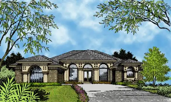 Palladian, or half-round windows are beautifully showcased as you approach the entry of this magnificent home. Through the double doors you'll enter the foyer which leads to the wonderful living and dining areas separated by large sliding doors. Walking towards the entrance to the master suite, you pass the den/study, which, by utilizing the pool bath, can easily become a guest or bedroom suite. Upon opening the double doors which lead into the master suite, the master bed wall becomes the focal point. A gently bowed soffit and stepped ceiling treatments add excitement, with floor length windows framing the bed. The bay window sitting area further enhances the opulence of this suite. The master bath comes complete with double vanity and make-up area and a soaking tub, balanced by the large shower and private toilet chamber. The walk-in closet caps off this well appointed space with ample hanging and built-in areas. The family wing of this particular home merges the island kitchen with walk-in pantry, mitered bay breakfast nook and family gathering space, with corner fireplace and gobs of glass for bright, sunny living. The two secondary bedrooms share ample space and access the hall bath.