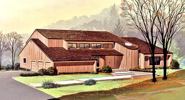 Entry is into a dramatic vaulted ceiling foyer, which is adjacent to the circular silo stair, a feature of the front. Formal living and dining rooms flank the foyer. The entire rear of the main floor is a large informal family entertaining area. The kitchen features a large island and is visually open to the breakfast room and family room. A guest suite or mother-in-law suite is privately located to the rear of the garage. The second floor includes a spacious master suite and three more large bedrooms. The home could be built with a 3-car garage if desired.