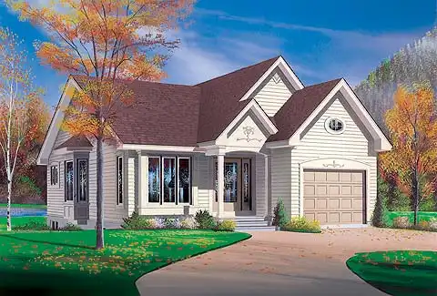 This 1,103 square foot cozy floor plan with its trio of gables and generous windows creates a charming facade on this narrow bungalow. An attached one-car garage provides sheltered transition from car to home. Guests will appreciate the covered entry and the openness of the interior. A forward-facing living room enjoys a generous window and the area transitions to the dining area with its own lovely bay window. A bright kitchen boasts generous storage, an eating peninsula, and patio doors to the back yard. The master bedroom has a generous bank of closets and private bathroom access. A second bedroom completes the main floor sleeping area. The plan includes an unfinished basement, which can be developed to suit or used as storage.