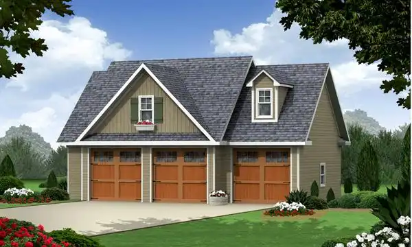 This three-car garage plan can be an excellent addition to your existing home or built all by itself. The first floor garage plan has plenty of space including a first floor laundry room! The private second floor includes a large bedroom with a living area. The sloped ceiling along with the front dormer located in the living area adds an unexpected architectural element to the second floor.