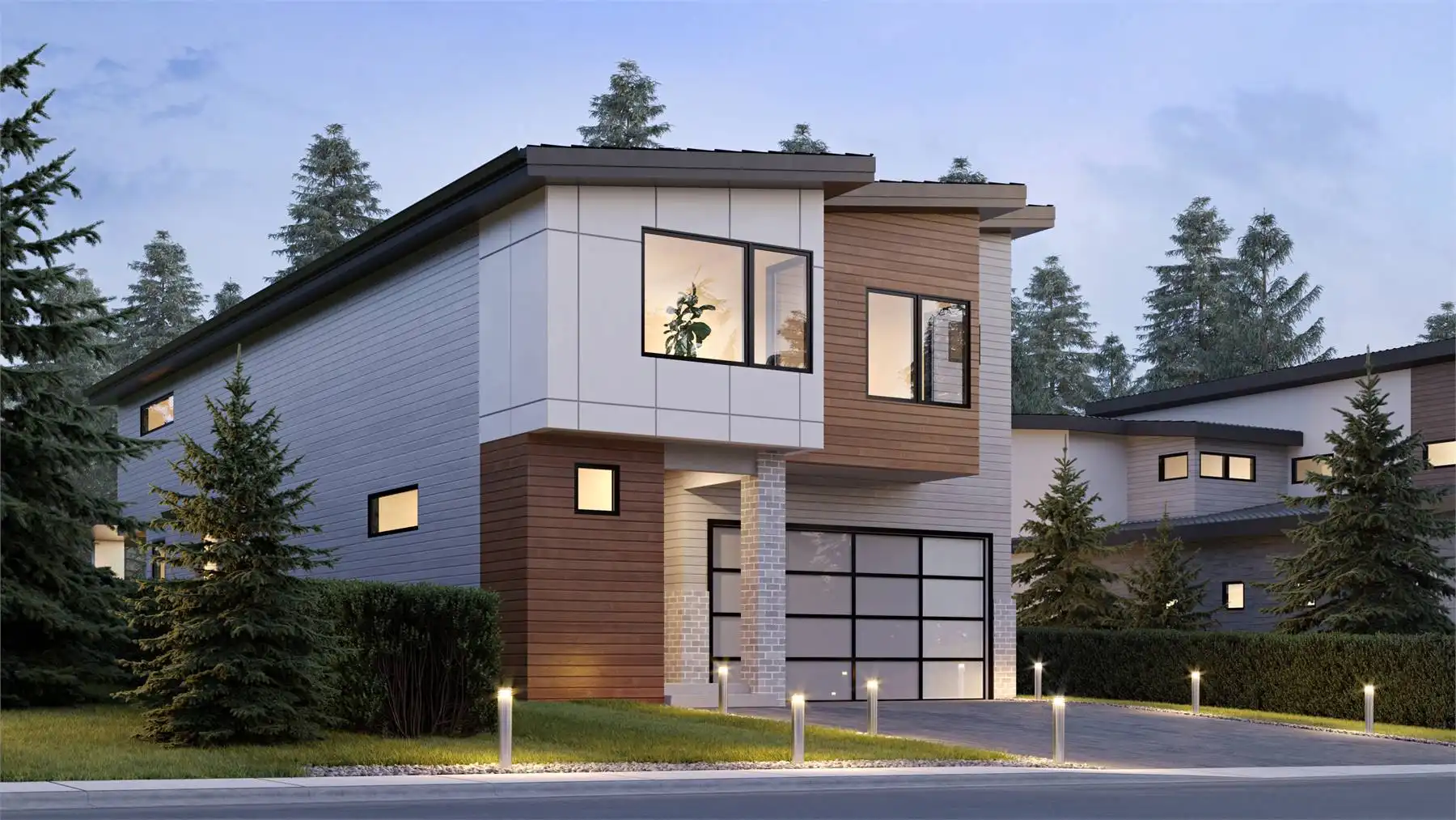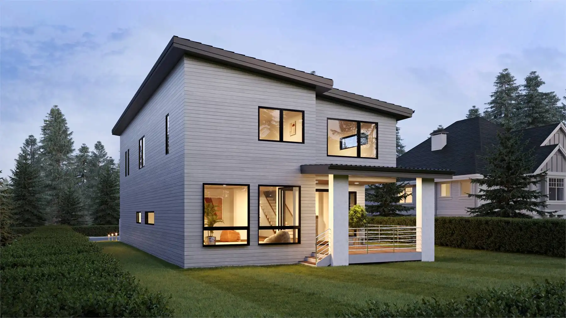 House Plan 4211 is a lovely narrow contemporary home for a growing family! It offers 3,008 square feet across two levels, with four bedrooms and two-and-a-half bathrooms in total. The main level features the powder room by the foyer and the open-concept great room with an island kitchen in back. There's also covered rear outdoor living space and a two-car garage in front. All the bedrooms are upstairs and include a luxe primary suite and three that share a hall bath. The laundry room is also located up here for convenience!