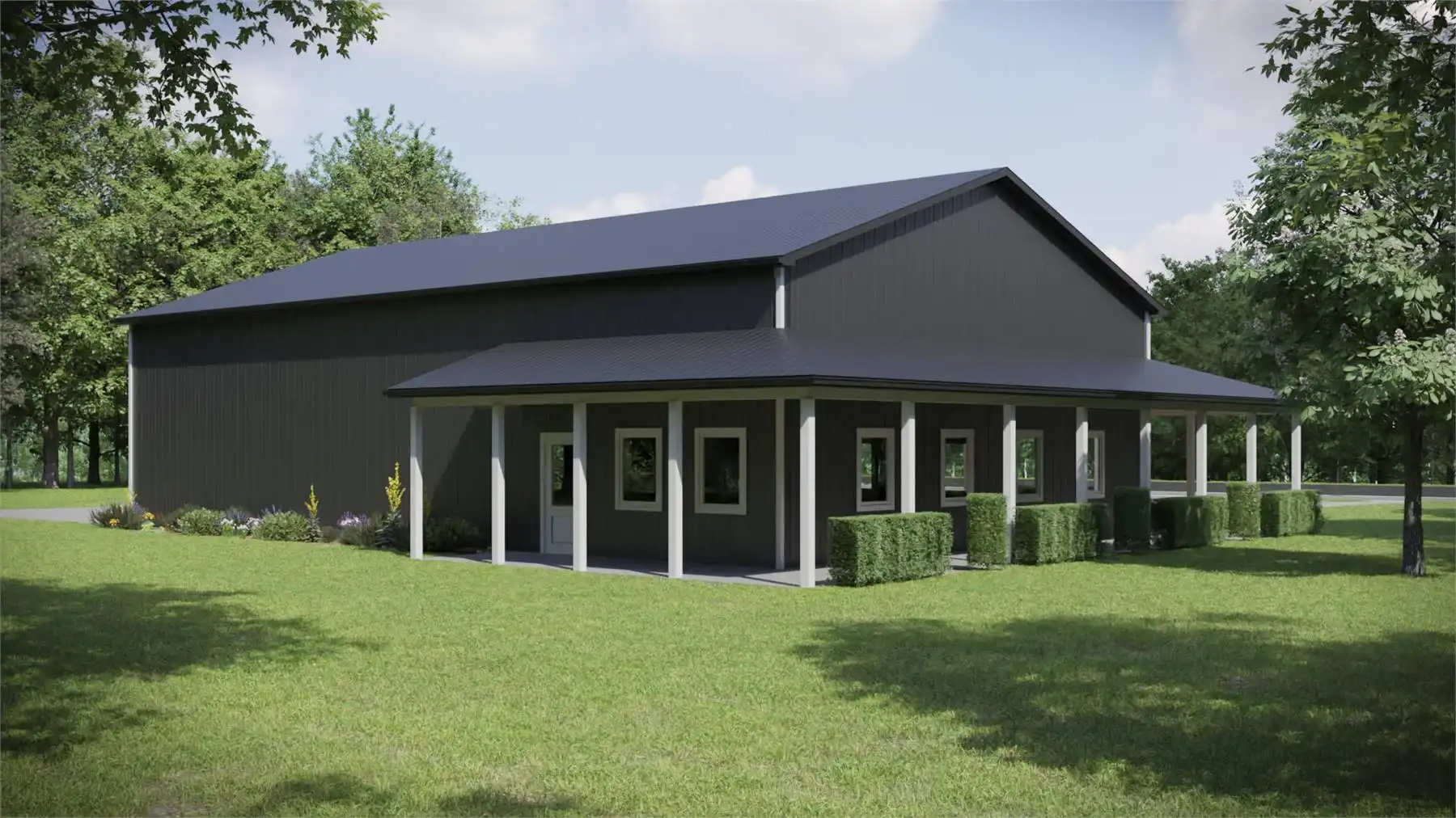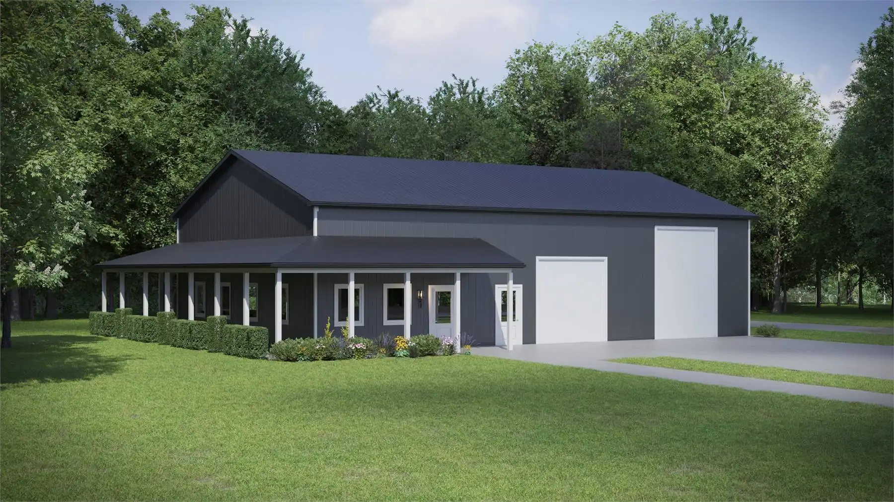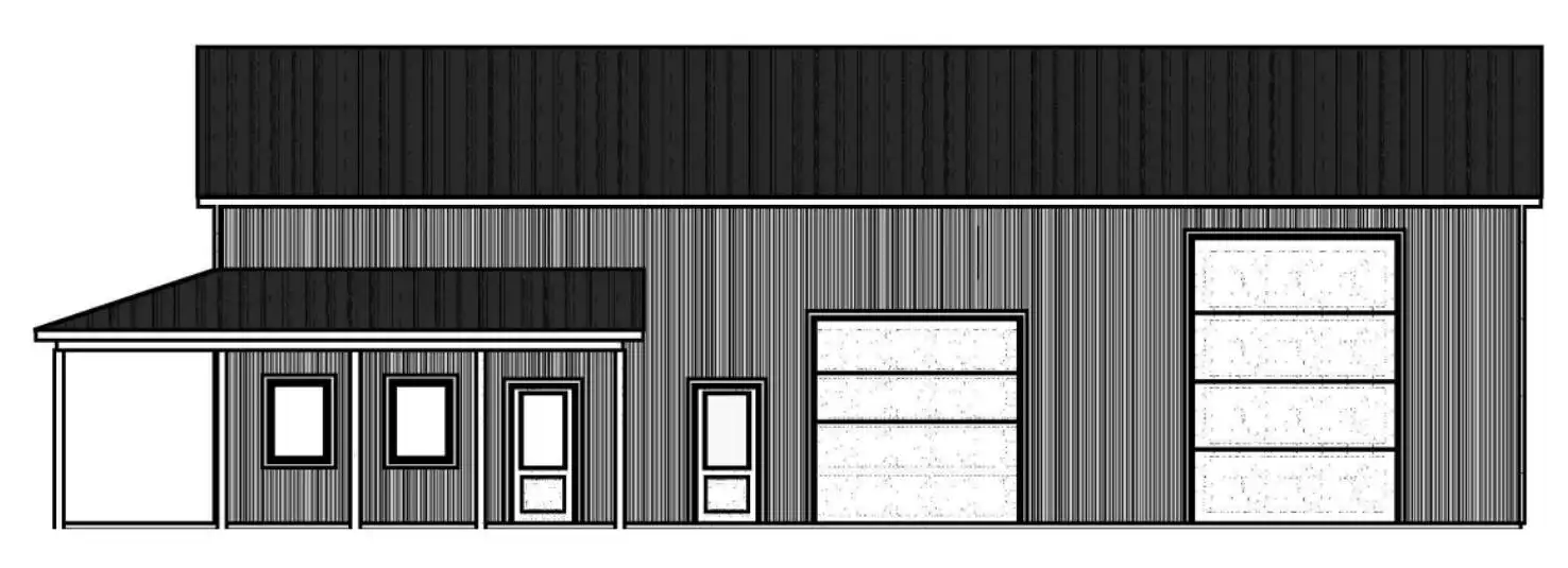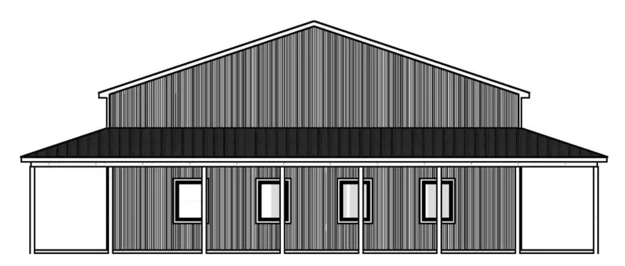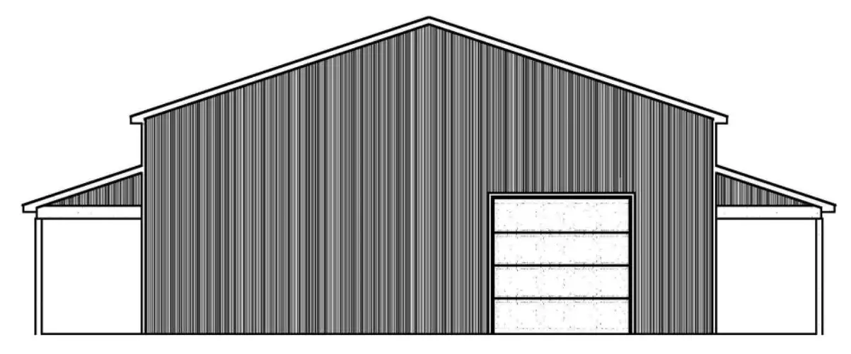 This design is perfect for those with a lot to park! It offers a simple, barndominium-style design with pole framing and a wraparound porch for interest. With 16' ceilings inside, two front bays, a side bay, and space for eight cars, you can keep all your vehicles covered!