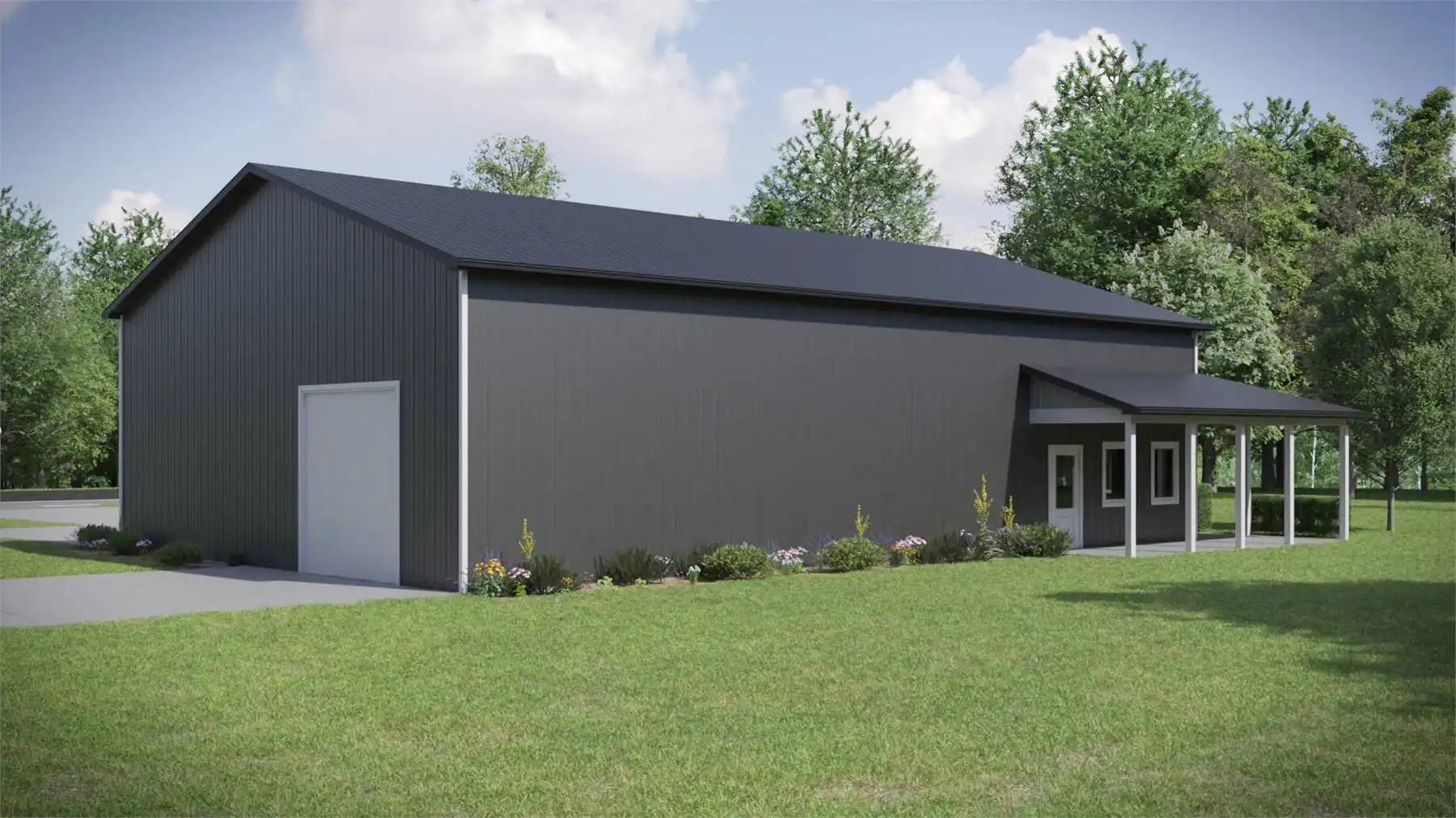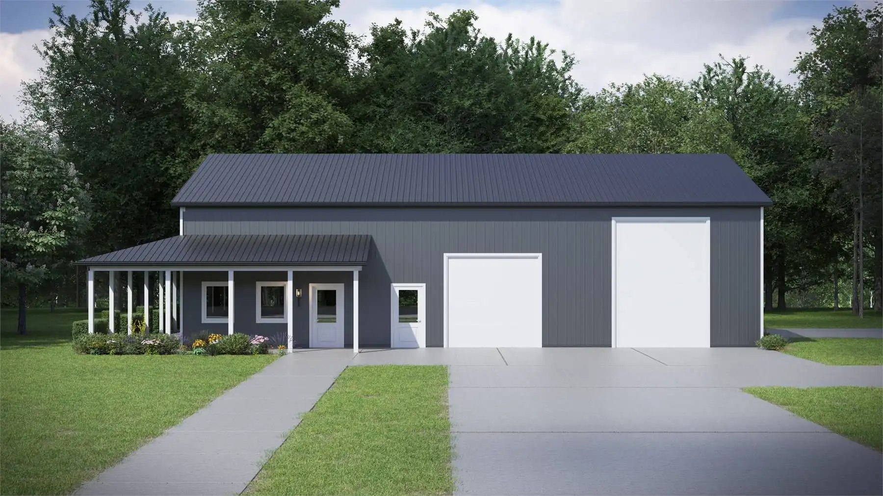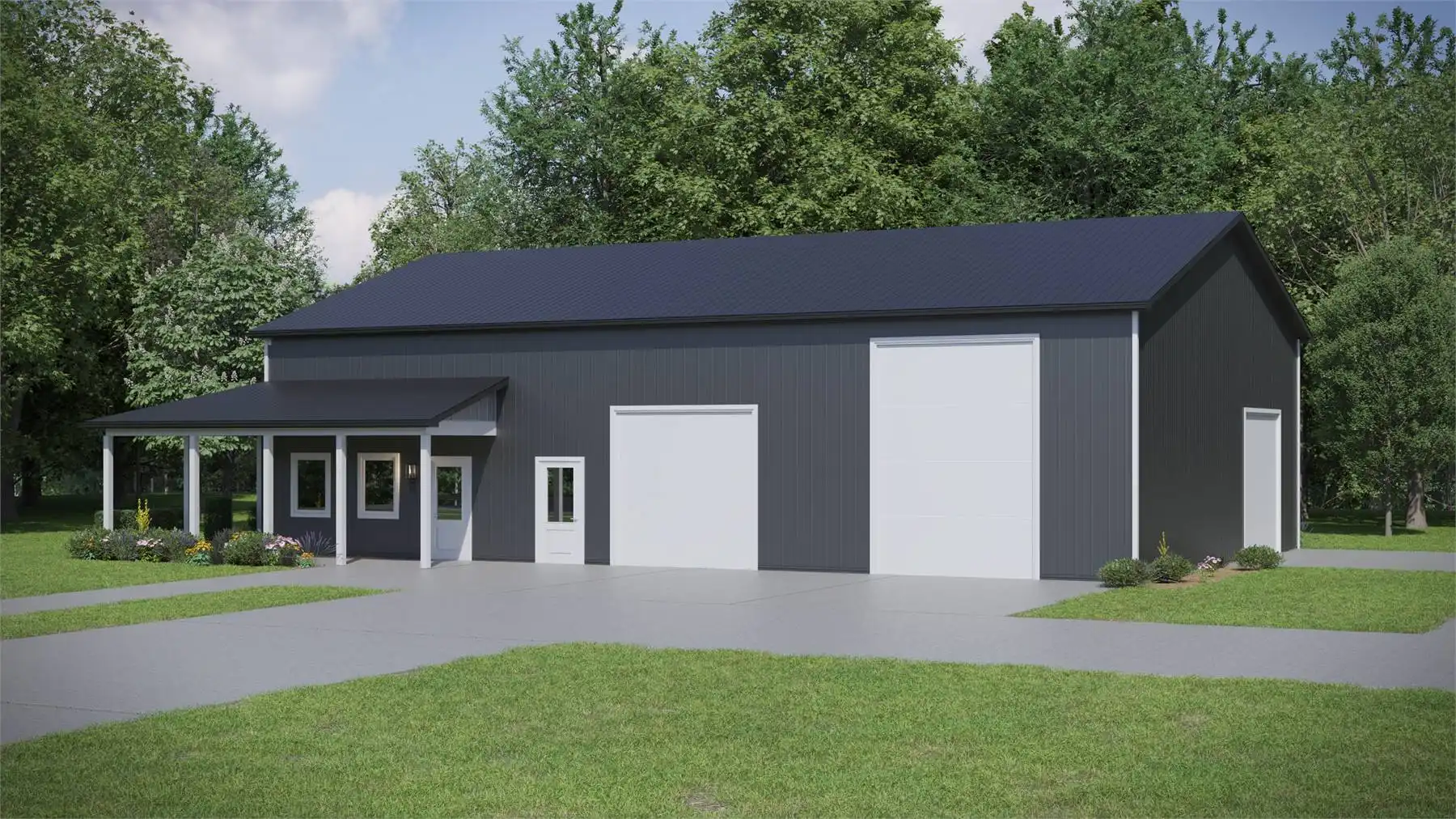 This design is perfect for those with a lot to park! It offers a simple, barndominium-style design with pole framing and a wraparound porch for interest. With 16' ceilings inside, two front bays, a side bay, and space for eight cars, you can keep all your vehicles covered!