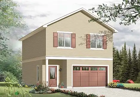 This popular house plan is perfect as a cottage with room for toys, as an interim dwelling while the main house is being built, or as a guest suite or mortgage helper, this little dwelling unit packs a lot of features into a small footprint. The ground floor features a one-car garage with workshop, laundry and interior or exterior access to the staircase. At the top lies an open-concept living area with an eat-in kitchen and living room. Two bedrooms share a bathroom with bathtub and separate shower. In high-density areas, this is an excellent design, including all expected amenities and an attached garage.
