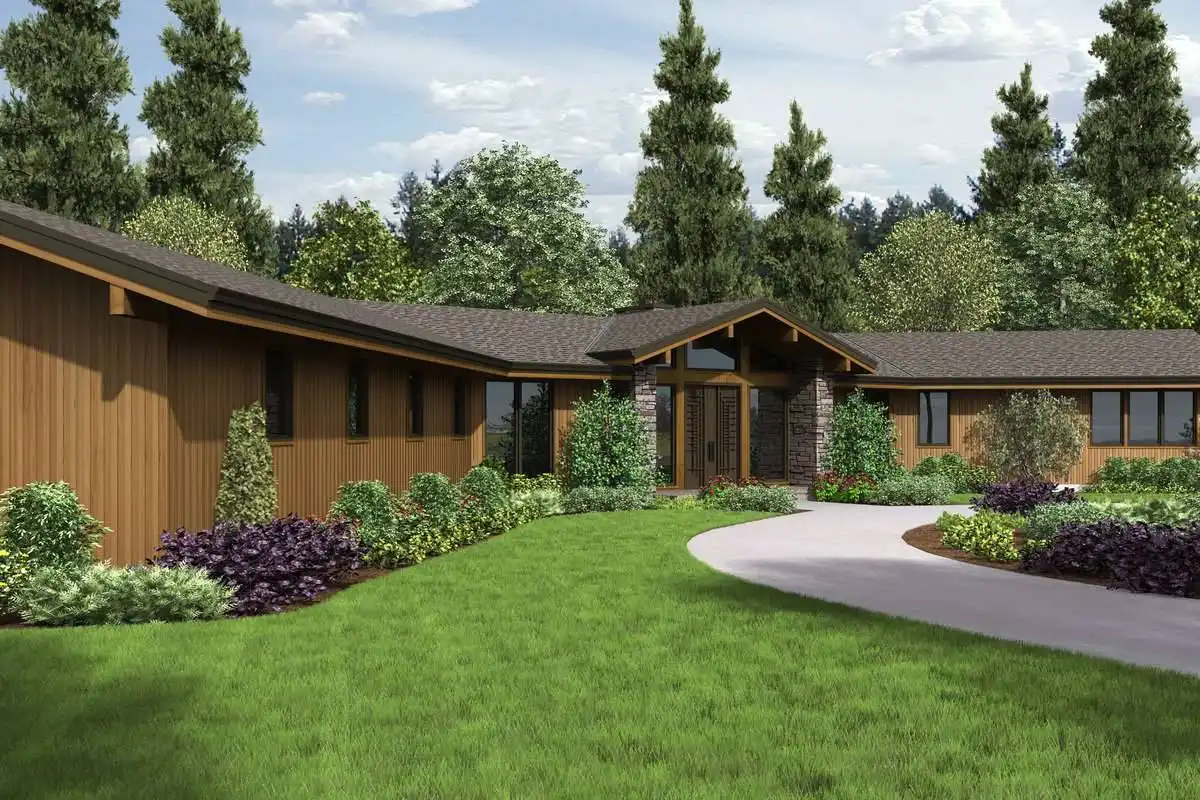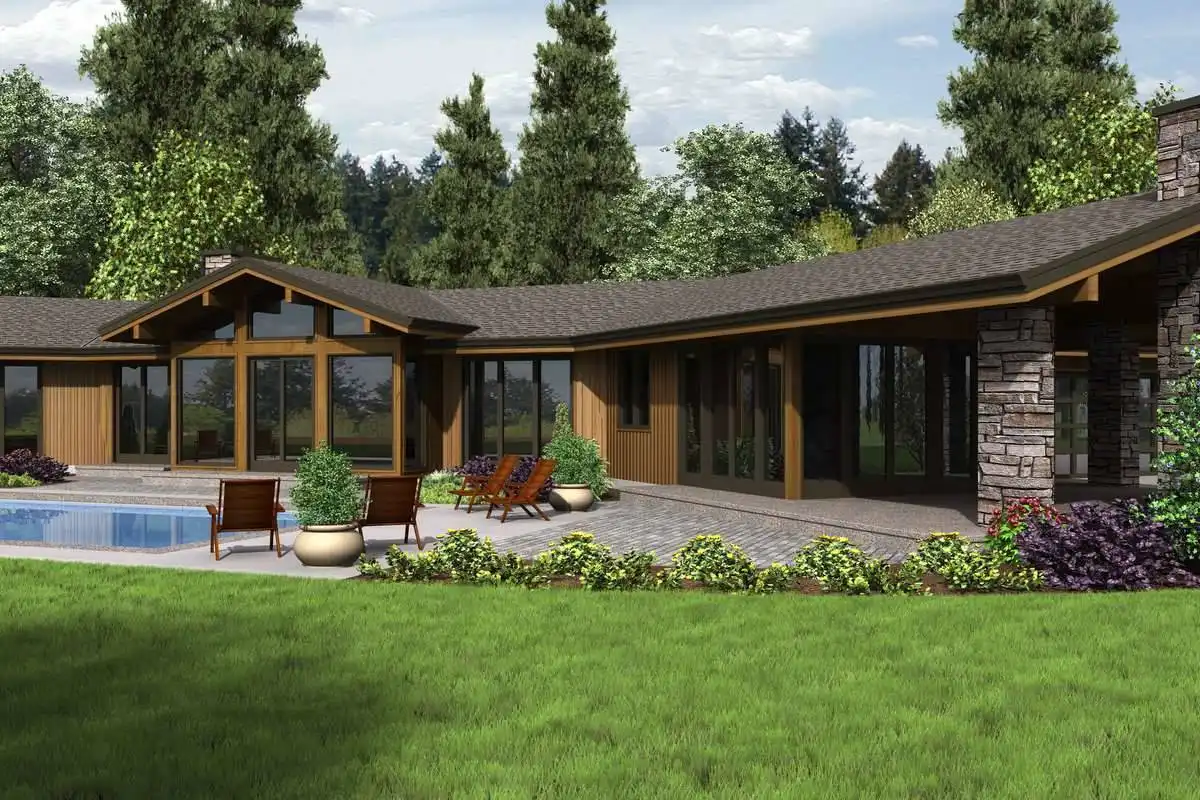 Stone accents and plenty of glass adorn this three-bedroom contemporary house plan. The unique layout of this home plan makes good use of its 3,278 square feet. This design is a smaller version of Plan 6774. Double doors introduce the welcoming foyer. Usher your guests into the vaulted living room for good conversation and tasty hors d'oeuvres. The gourmet kitchen serves the sizable dining room with ease. The family room offers fantastic backyard views. When weather permits, you'll enjoy the outdoor living area with its crackling fireplace. The opulent master suite is a peaceful haven at day's end; how about soaking in the spa tub?