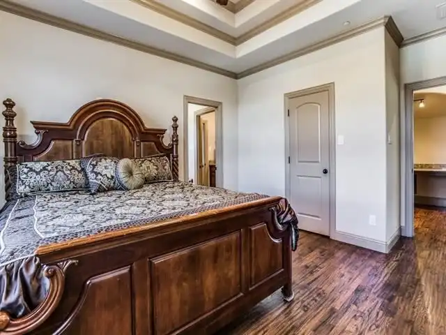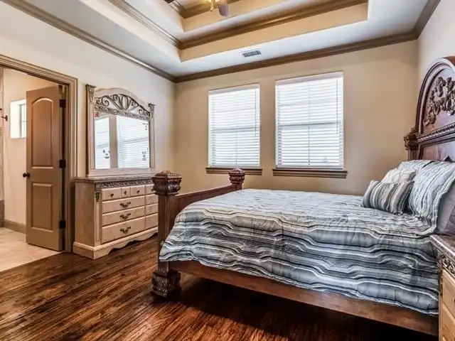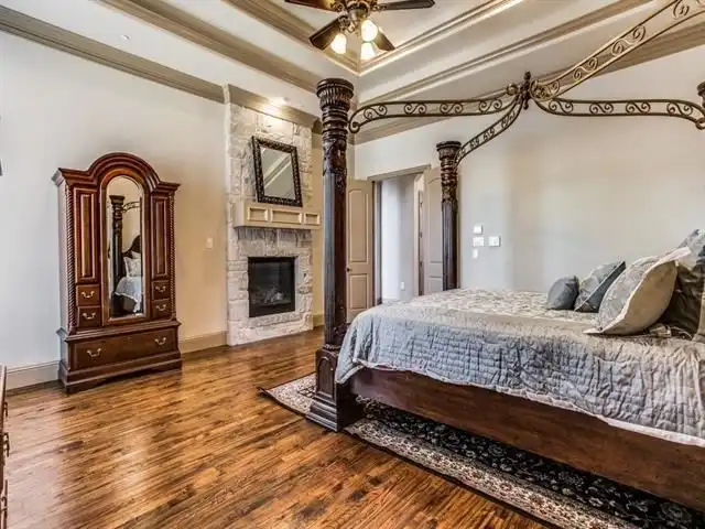 magnificent master suite, compete with a 14-foot triple trey ceiling, warming fireplace, and luxurious master