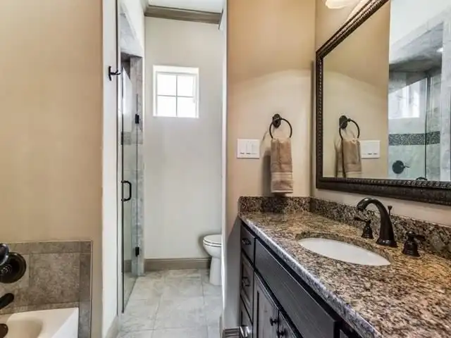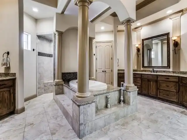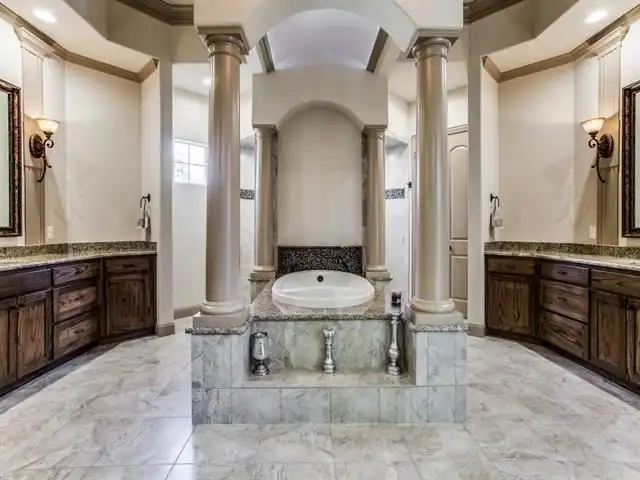 bath that includes a his and hers vanity and a center tile luxury Jett bath tub embellished by massive pillars