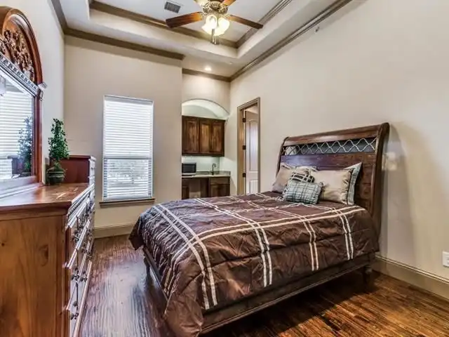 separated by a big utility room, exercise room and bar. The bar offers access to a media room with a 12-foot