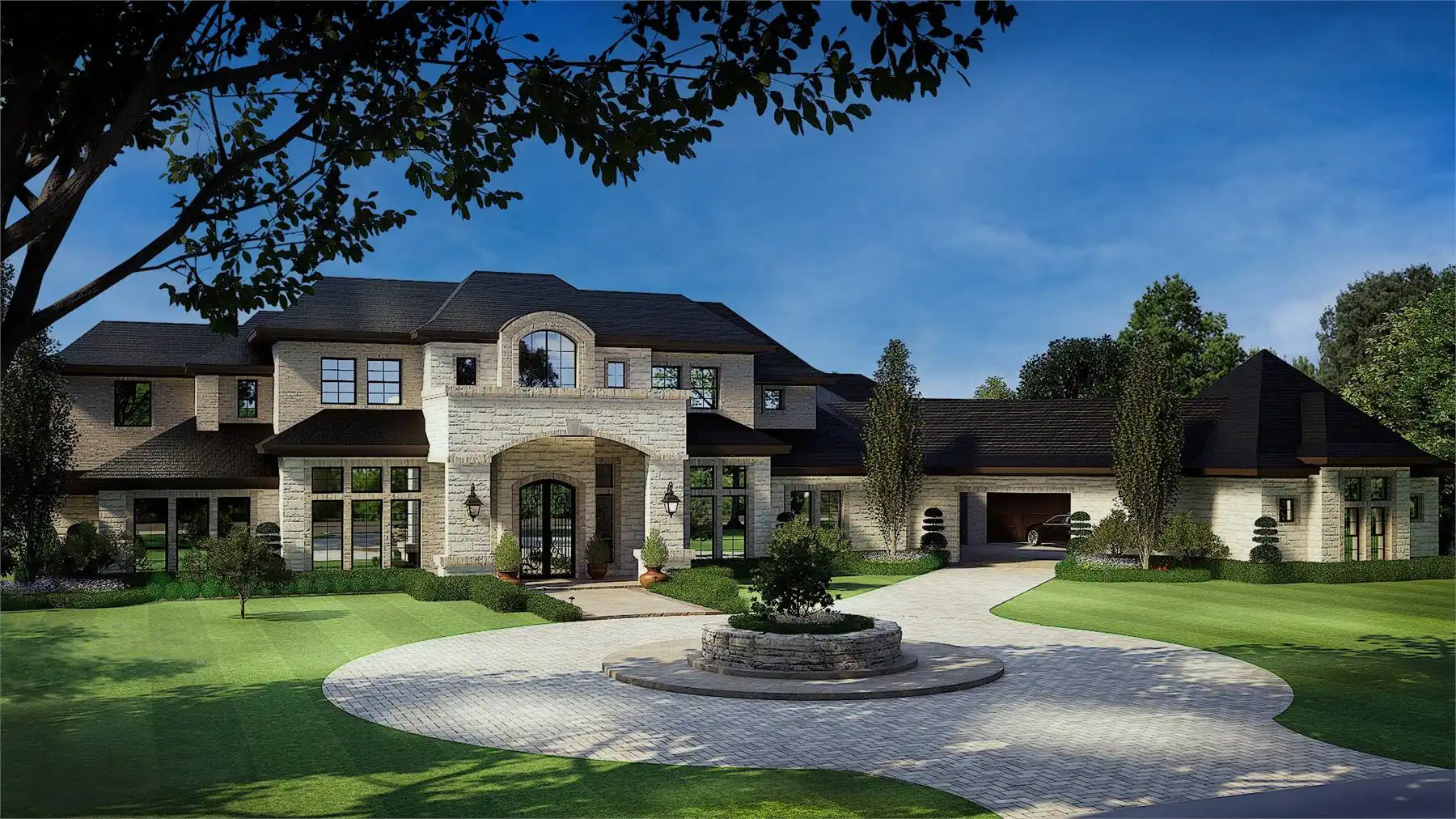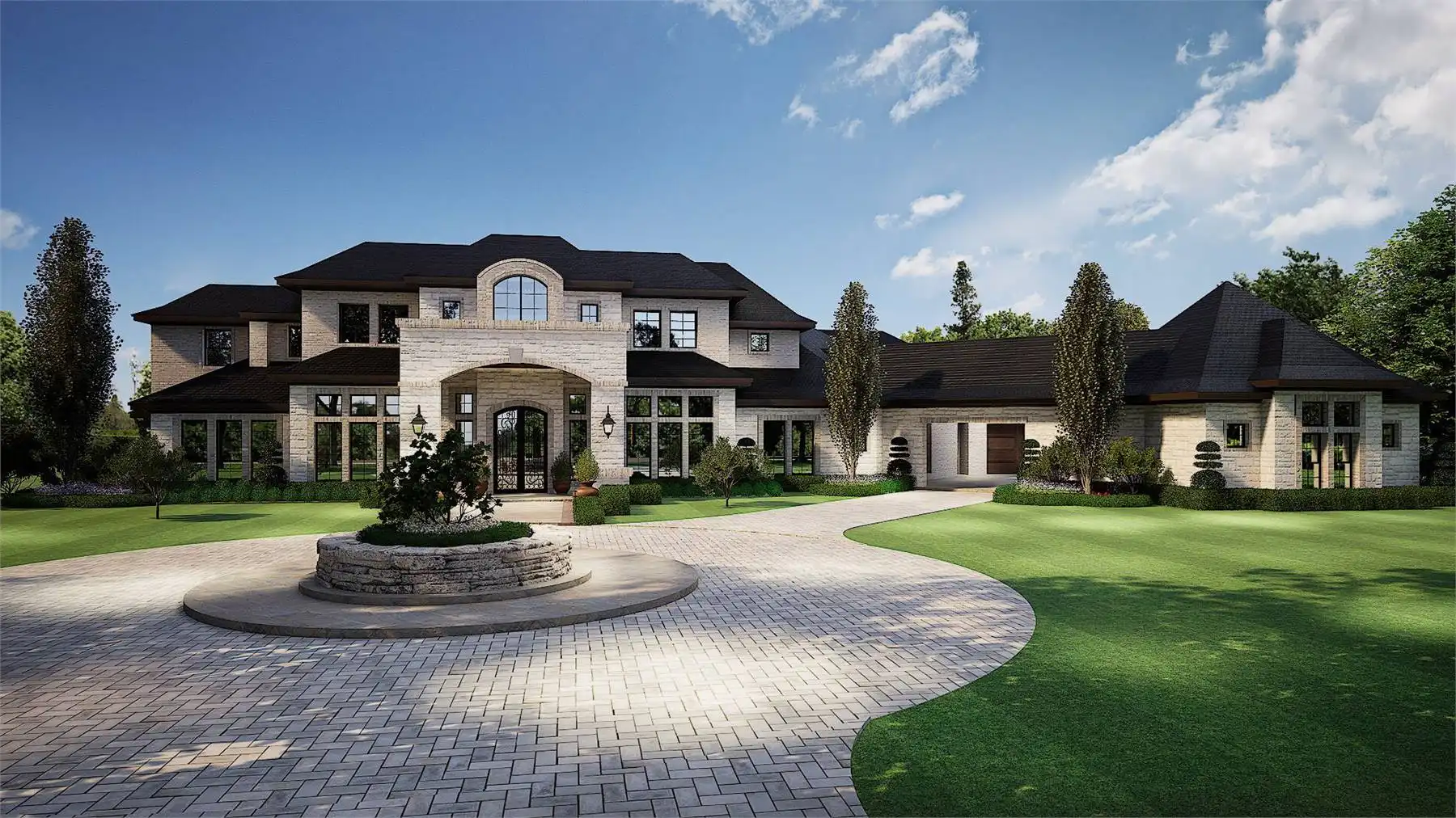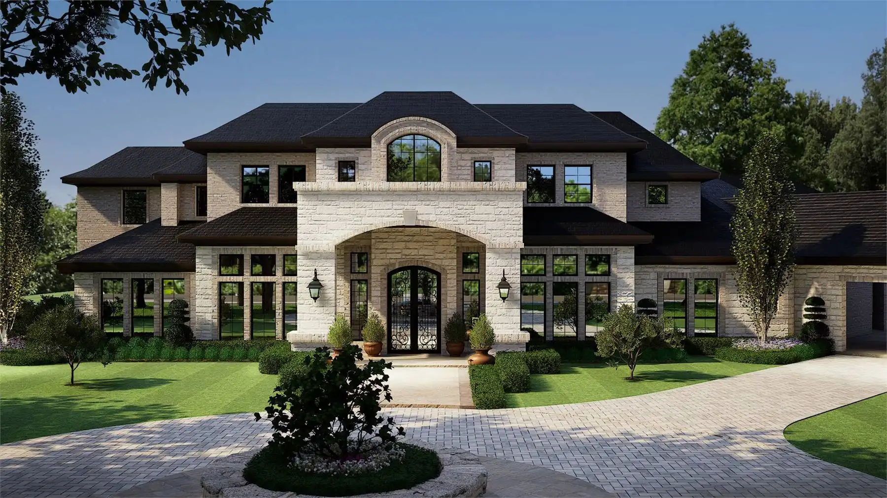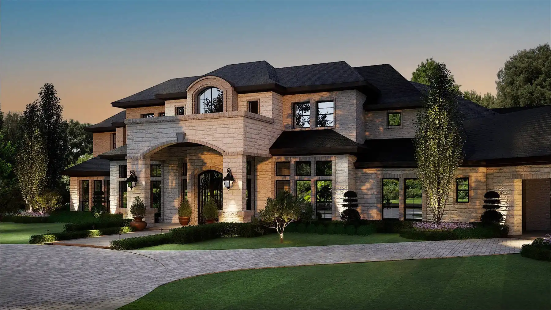 façade is highlighted by multiple roof levels and stylish windows with an arched, two-story covered entry,