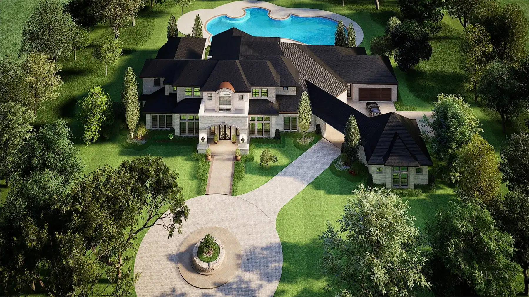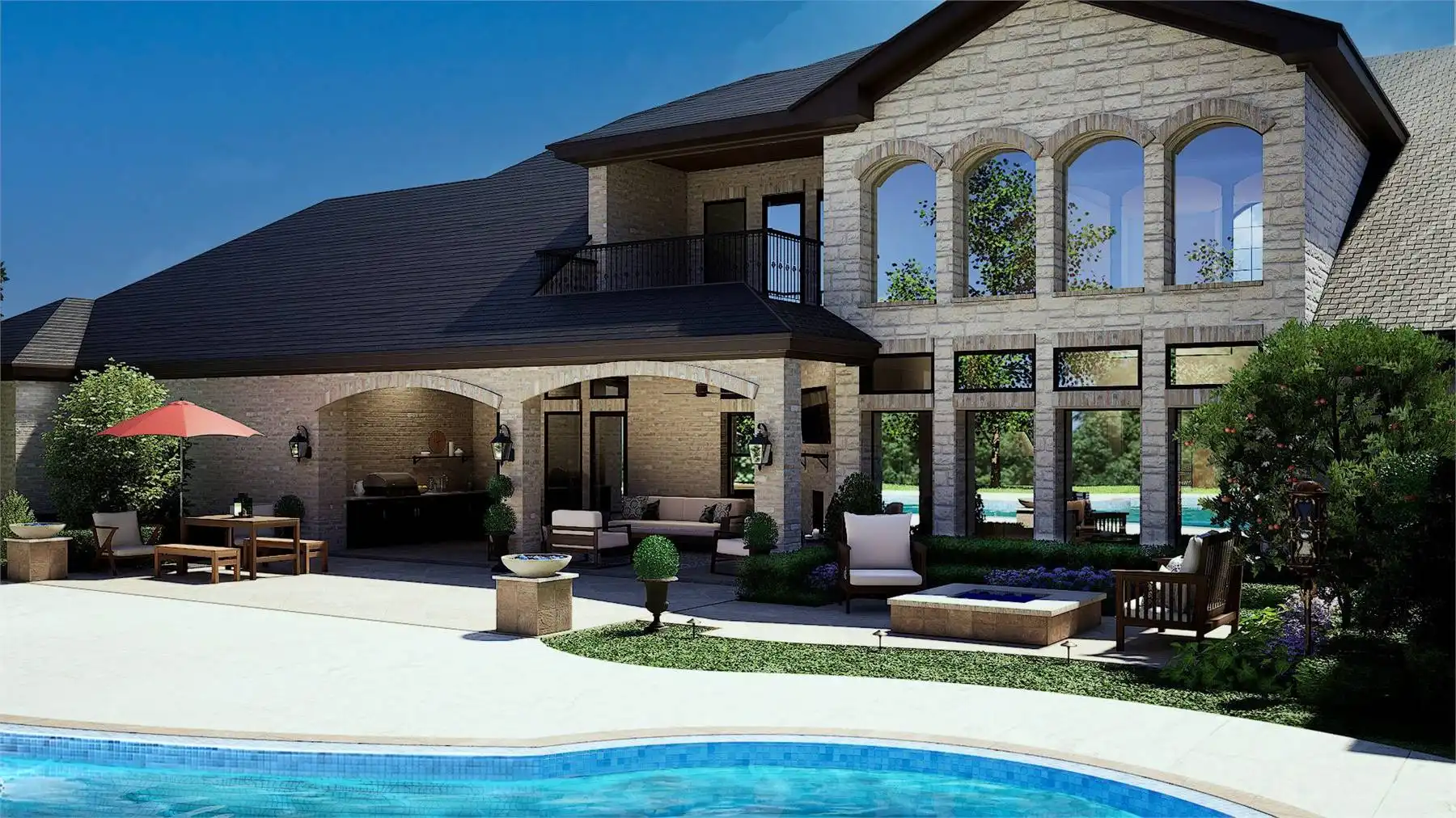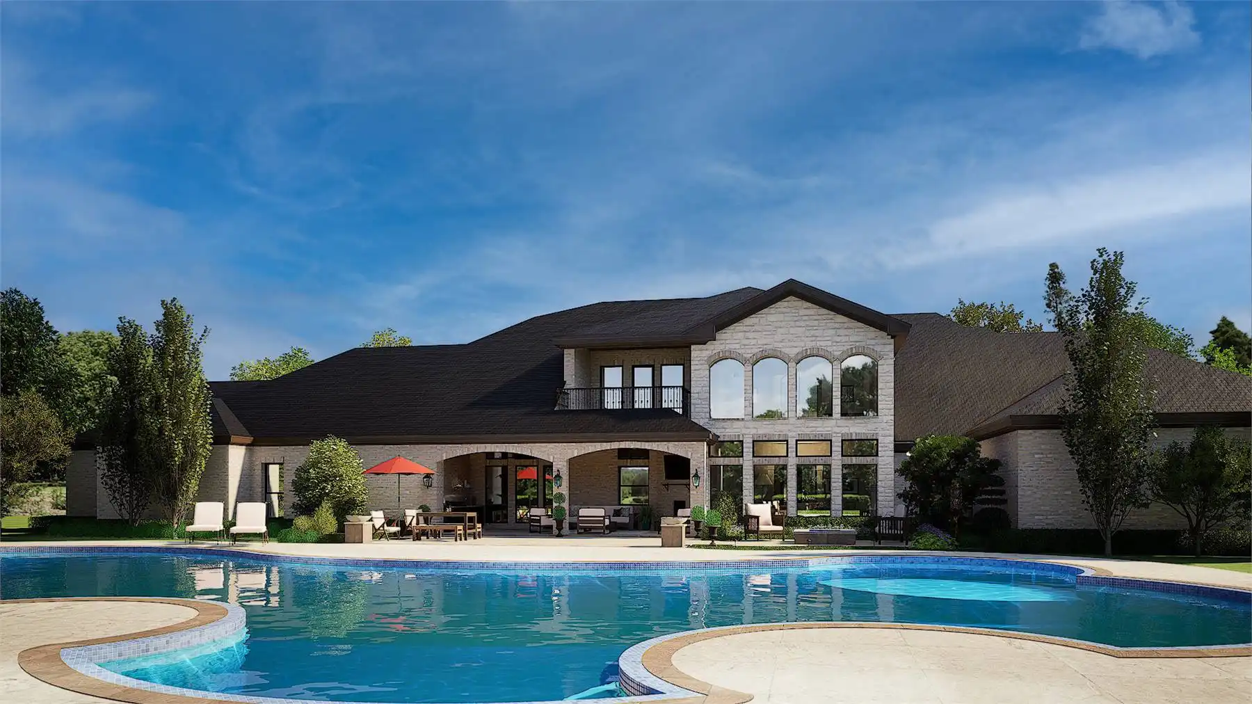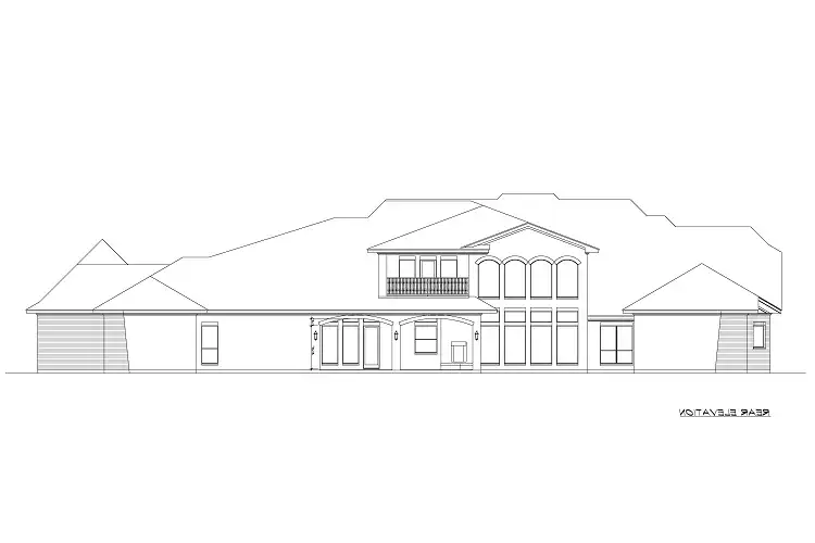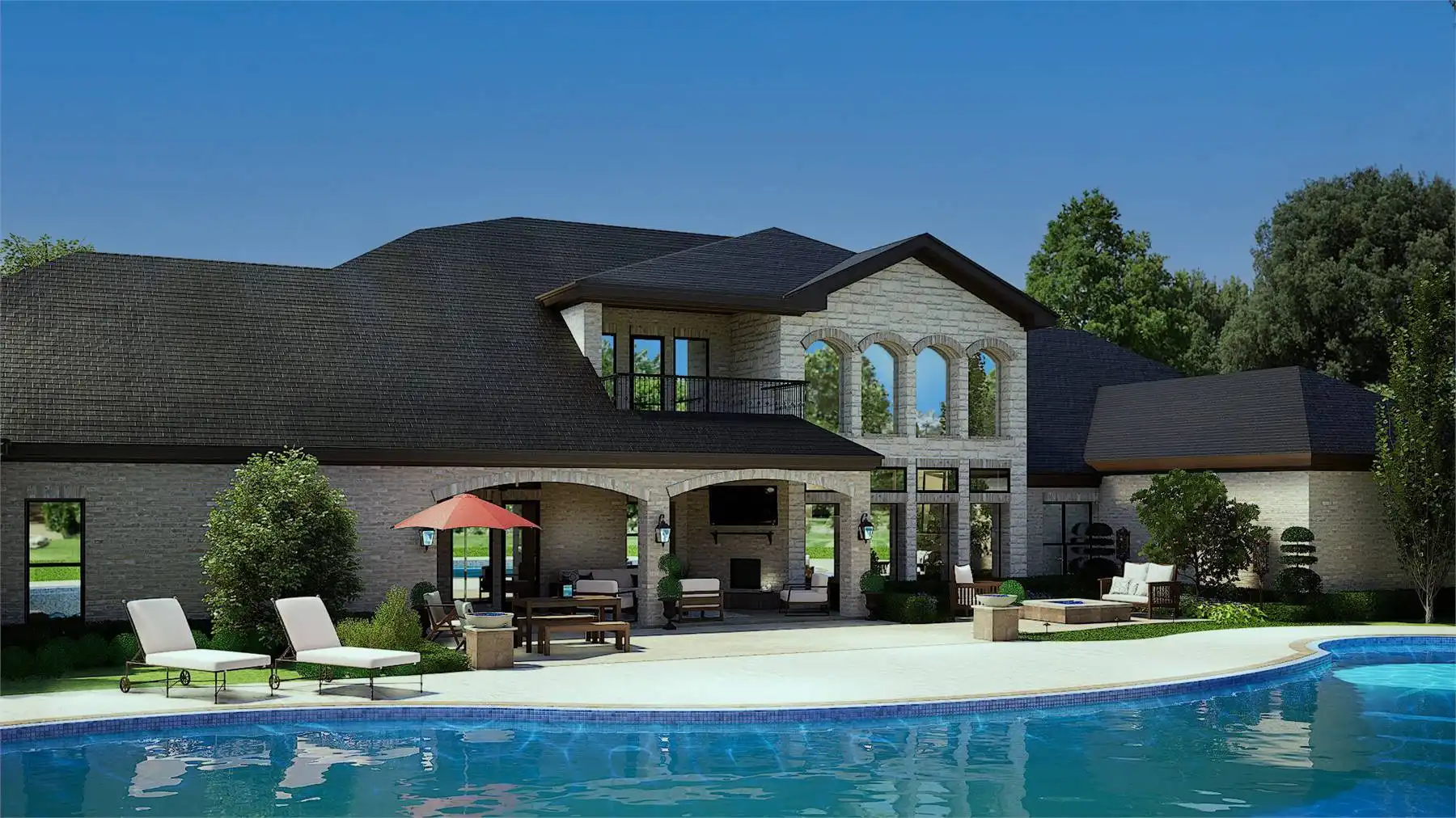 façade is highlighted by multiple roof levels and stylish windows with an arched, two-story covered entry,