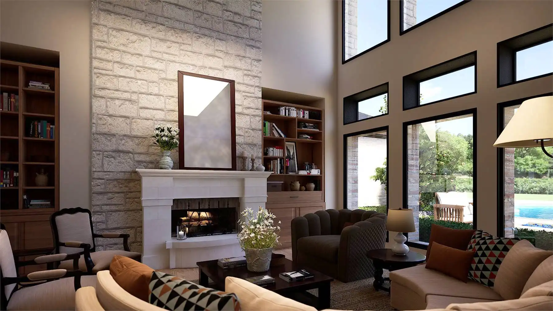 the expansive two-story great room with its dramatic and stunning fireplace of stone, a wall of windows, and