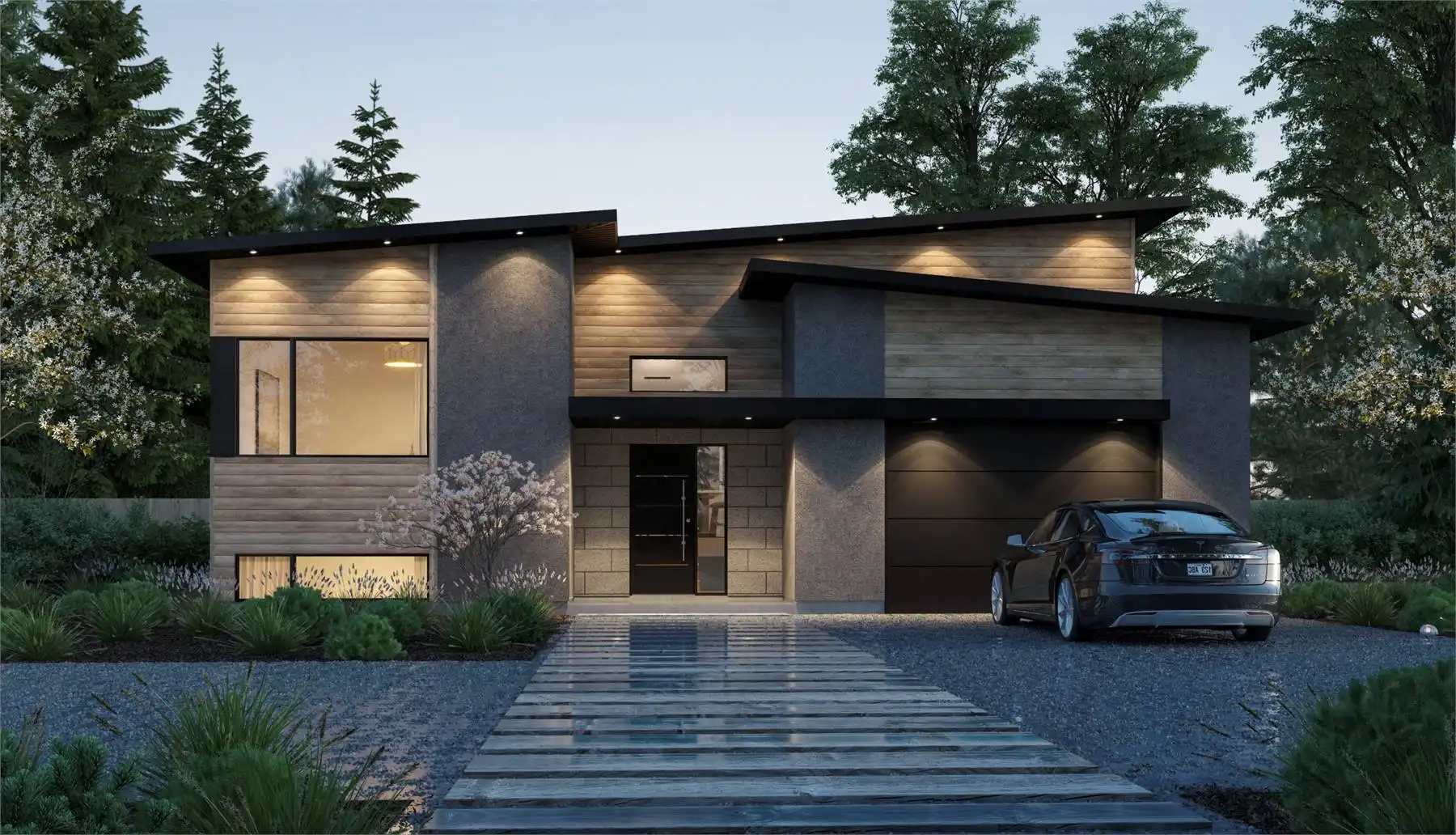 House Plan 4306 is a beautiful bi-level contemporary home with a classic raised ranch layout, 2,938 square feet, four bedrooms, and two bathrooms. The main level sits on top with the open-concept living areas, two bedrooms, and a large bathroom. The lower level has two bedrooms, a bathroom, the family room, and an office. This home also has a one-car garage and a covered terrace in back.