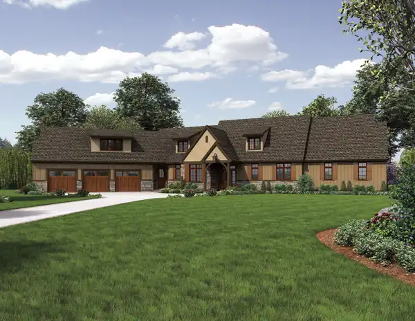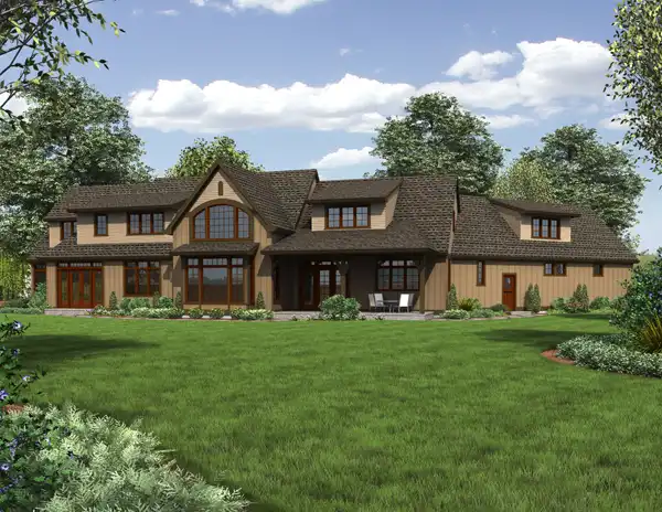 Ideal for acreage, this home design offers lots of luxury without waste. Transitional spaces are kept to a minimum, while rooms are well defined and accessible - this home plan is extremely livable. A large feature foyer leads to an open great room and gourmet kitchen. Expansive windows look out to available views, while a large covered patio provide a great connection to the outdoors. The Master suite is fit for a king, and four additional bedrooms and a guest suite provide sleeping spaces for all your extended family. Additional spaces include fantastic office and laundry spaces, a mudroom, fantastic balcony overlooking the great room and a huge bonus room.
