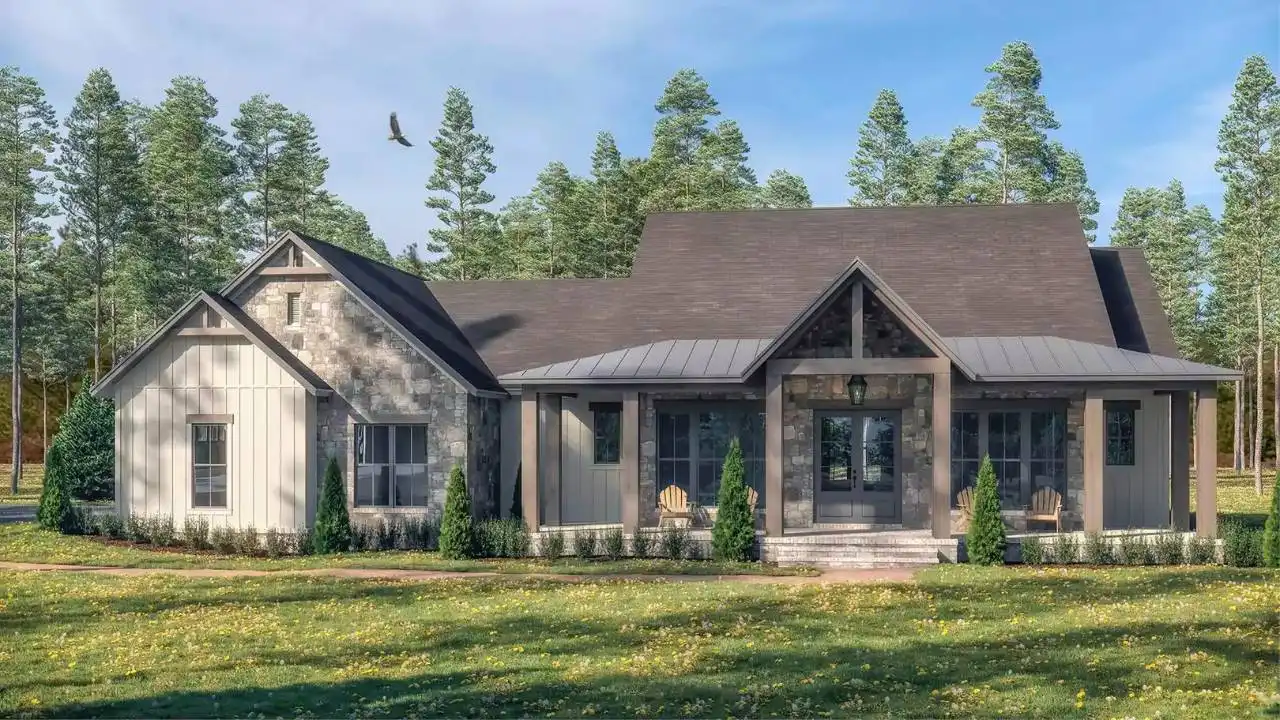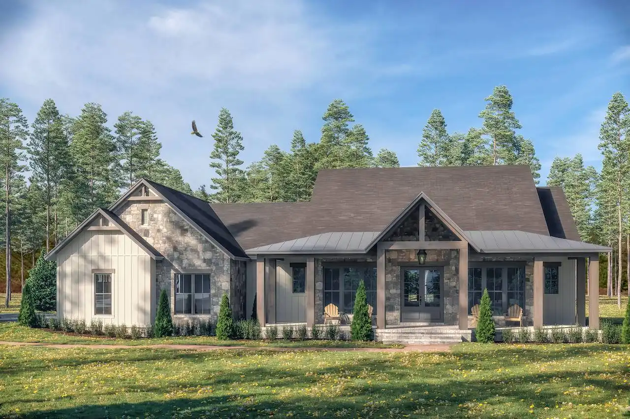 House Plan 4369 has 2,195 square feet in a sprawling layout that seems bigger than it is, and with its rugged, naturally inspired exterior, you know this ranch would be perfect out in the country! The vaulted great room makes up the heart of the home and is ideal for hosting. It sits beside the island kitchen--complete with a huge pantry for stocking up--and the informal dining area. If you're looking for some defined space to get stuff done, look no further than the office off the foyer. The bedrooms are split across these central areas, with the master suite behind the kitchen and garage and the other two bedrooms on the opposite side. The kids will enjoy their own walk-in closets and a Jack-and-Jill bathroom, and there's also a built-in study area just outside the bedroom doors. The owners will be treated with their own vaulted ceiling in the bedroom, a large five-piece ensuite, and a walk-in closet that connects to the laundry room. House Plan 4369 is an awesome design that gives you so much to appreciate across one level!