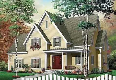 With porches in front and back, this 2,028 square foot country farmhouse always shows a pleasant face. A fireplace bordered by built-ins warms the open living area, consisting of living room, dining room and kitchen with island and breakfast bar. An office or flex room completes the main level. Upstairs, the master suite includes a walk-in closet and five-fixture bathroom. A laundry room is conveniently located off the second full bath which accommodates the two additional family bedrooms - what joy!  Bonus space over the side-loading garage allows for future expansion of additional recreation or bedroom space.