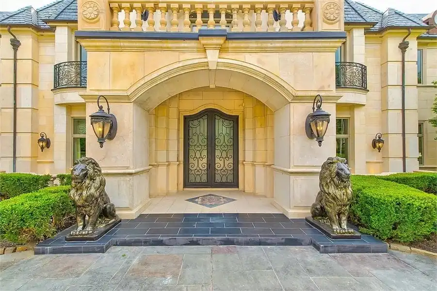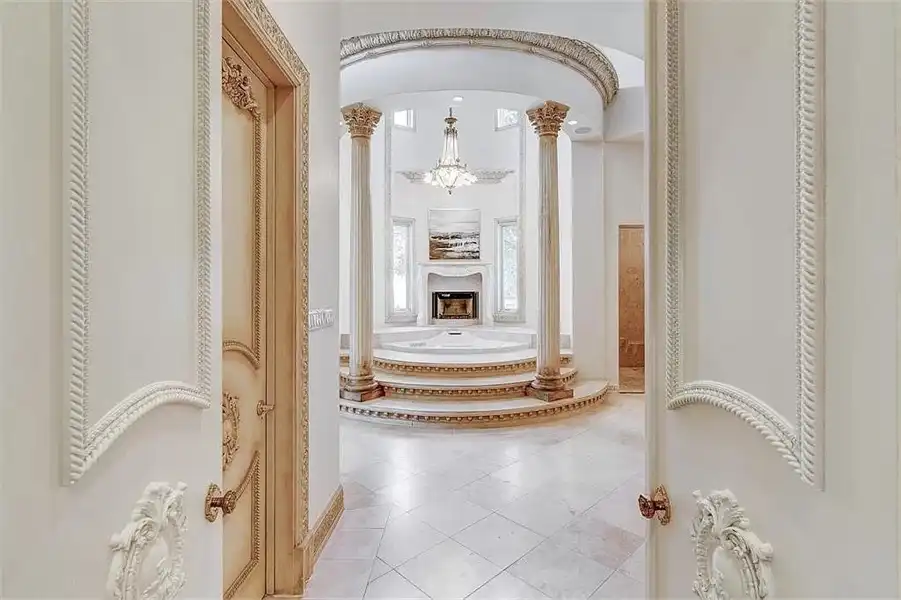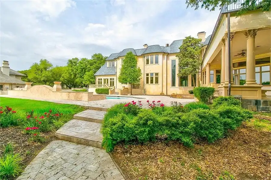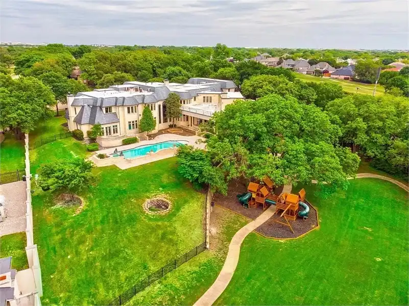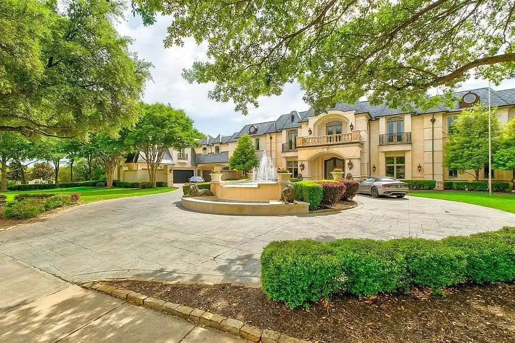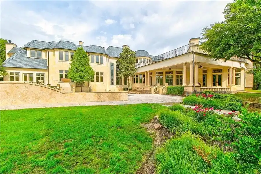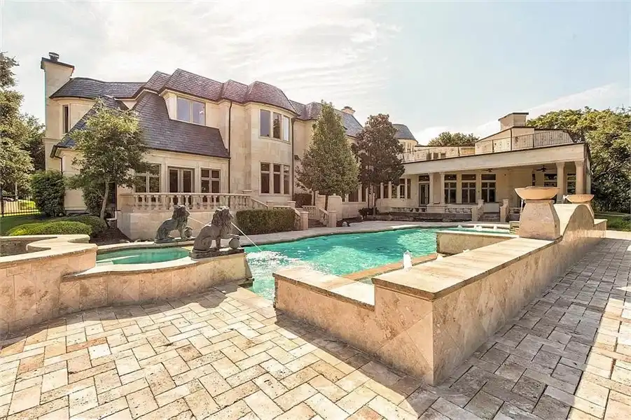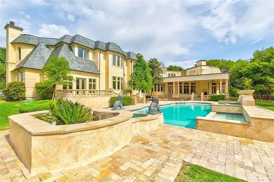 This sprawling estate home will attract visitors and passersby with its French inspiration. A welcoming motor court leads to garages that accommodate nine vehicles. Inside, the grand foyer is flanked by a study and the formal dining room. The latter shares a fireplace with a cozy bistro. A curved breakfast nook offers backyard views. The island kitchen is open enough to serve several rooms with ease. Relax with the kids in the family room, billiard room and cabana. The billiard room features unique booth seating with a fireplace. You'll appreciate the luxurious master suite, with its fireplace, sitting bay, whirlpool tub, separate shower and exercise room. A circular staircase leads up to a restful retreat. Also on the upper floor, a game room hosts a refreshing wet bar and a special area for card games. A media room leads to a bonus room and a den and eatery. A fun roof patio adjoins an outdoor lounge for stylish entertaining. A guest suite will pamper your visitors and help them to relax after their trip. Numerous additional bedrooms and baths round out the floor plan.