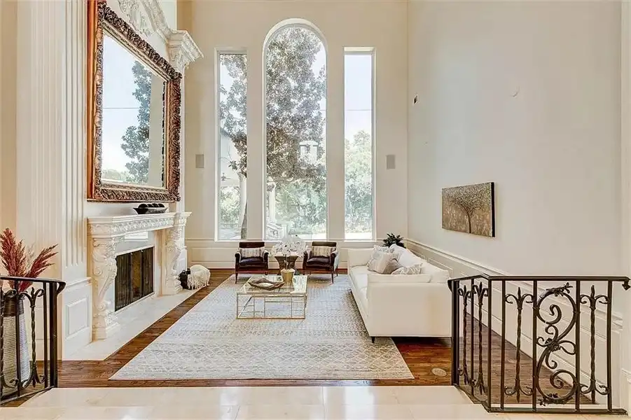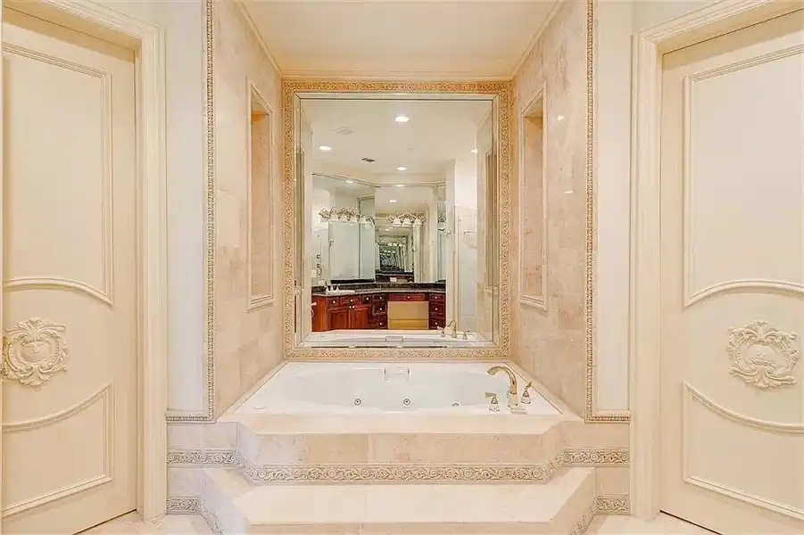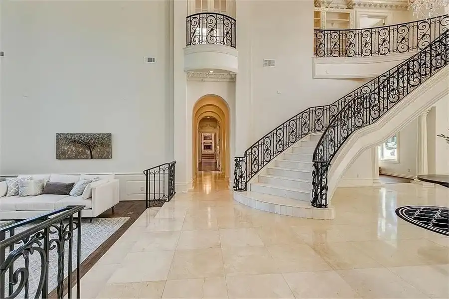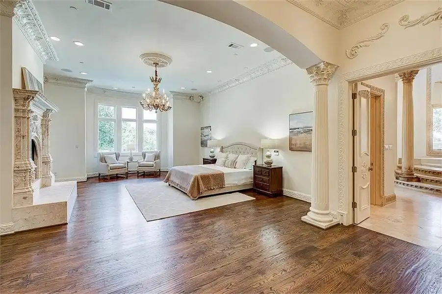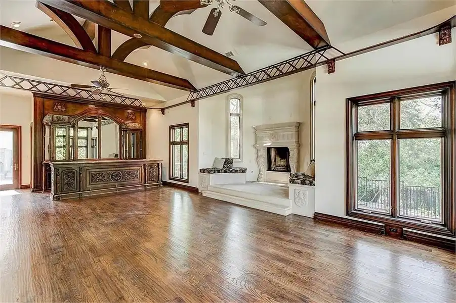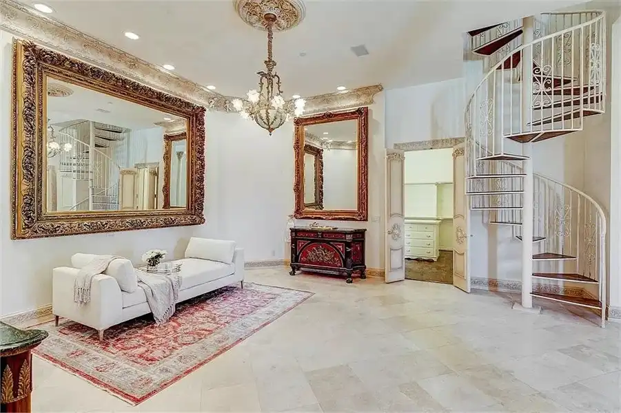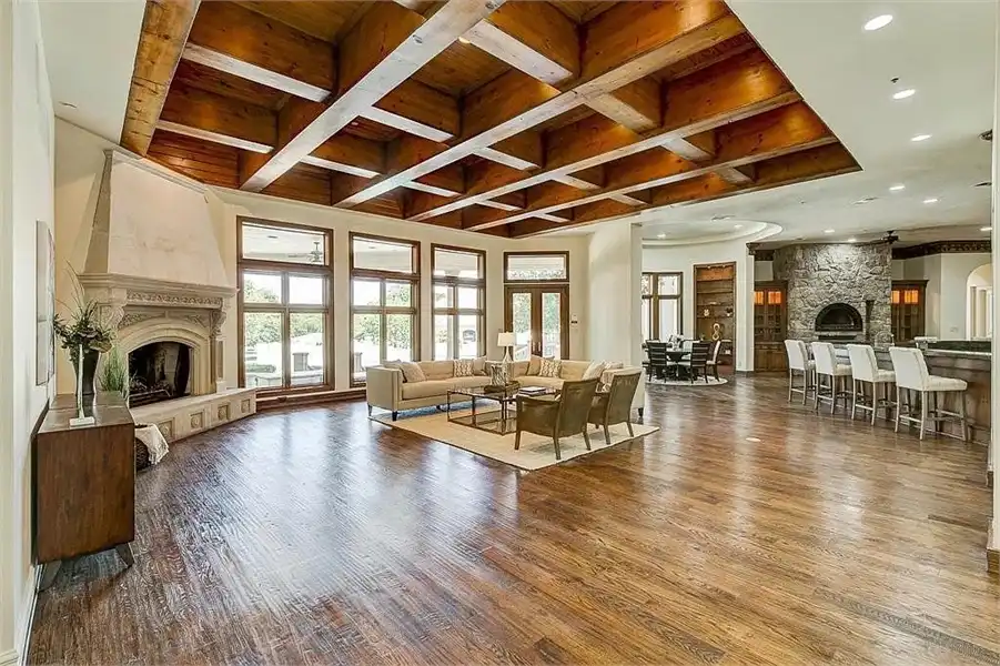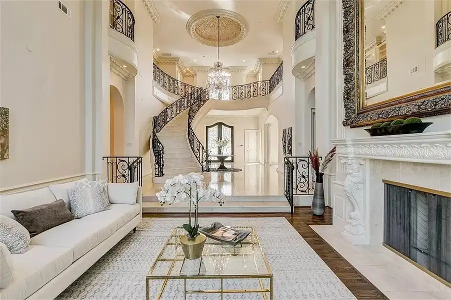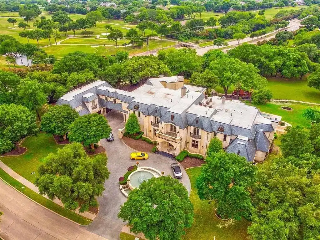 This sprawling estate home will attract visitors and passersby with its French inspiration. A welcoming motor court leads to garages that accommodate nine vehicles. Inside, the grand foyer is flanked by a study and the formal dining room. The latter shares a fireplace with a cozy bistro. A curved breakfast nook offers backyard views. The island kitchen is open enough to serve several rooms with ease. Relax with the kids in the family room, billiard room and cabana. The billiard room features unique booth seating with a fireplace. You'll appreciate the luxurious master suite, with its fireplace, sitting bay, whirlpool tub, separate shower and exercise room. A circular staircase leads up to a restful retreat. Also on the upper floor, a game room hosts a refreshing wet bar and a special area for card games. A media room leads to a bonus room and a den and eatery. A fun roof patio adjoins an outdoor lounge for stylish entertaining. A guest suite will pamper your visitors and help them to relax after their trip. Numerous additional bedrooms and baths round out the floor plan.