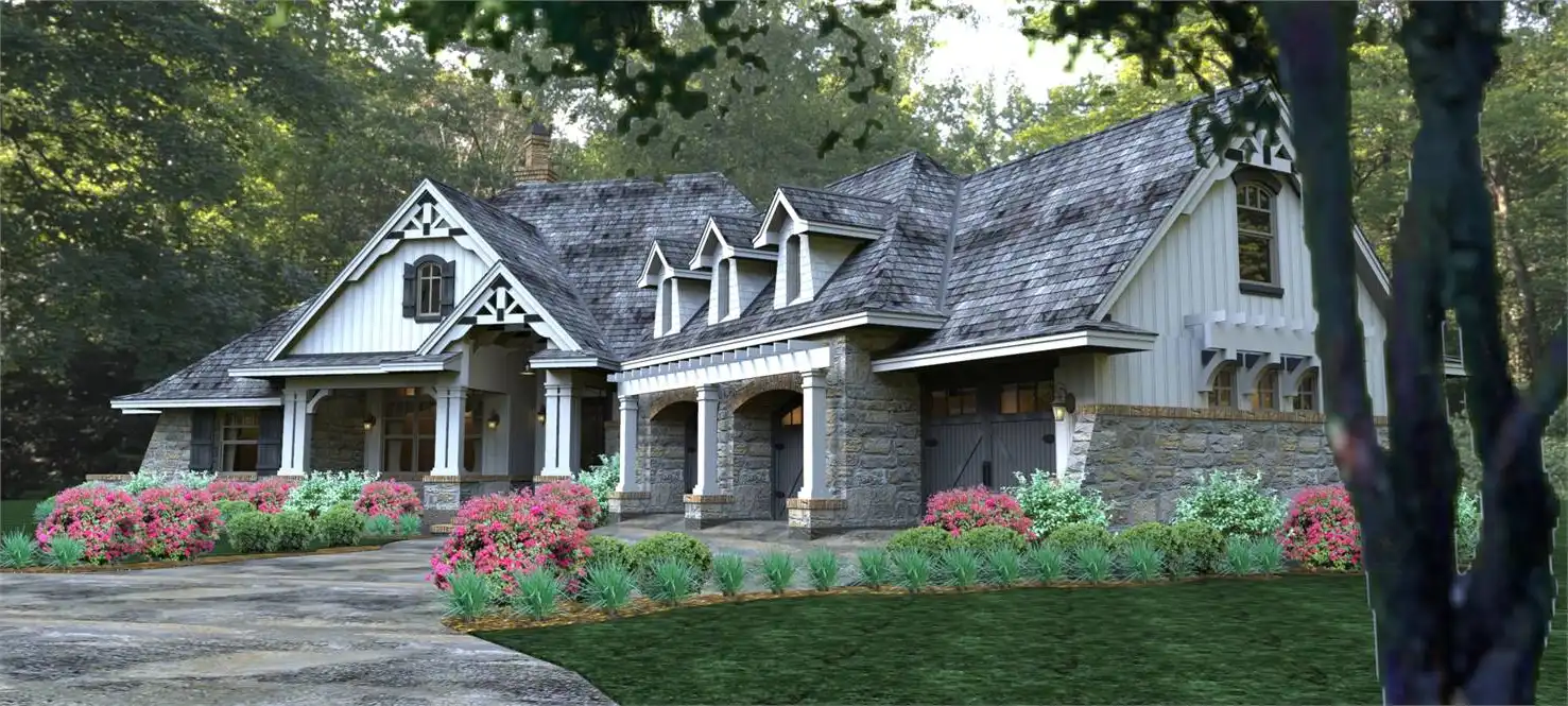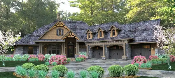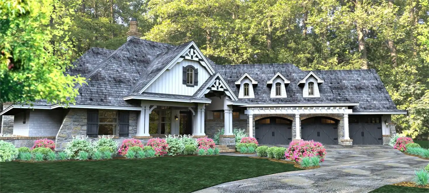 The 3-car garage is front-loaded to allow for tighter lot configurations and still includes a bonus area, which makes use of triple dormers for natural light.