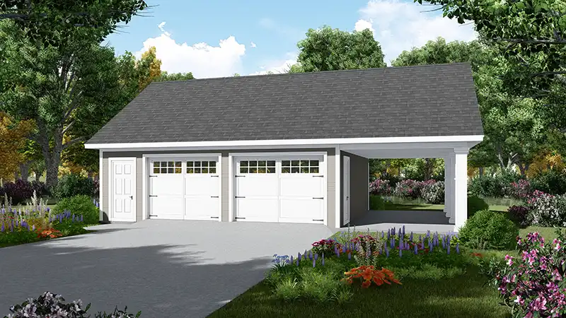 This ranch-style garage plan includes ample space for two cars, with a grand total of 1,040 square feet. The convenient storage closet could hold lawn equipment or tools. A third car may be accommodated in the covered carport of this design, away from rain or hail. Our customers love the beautiful façade of this plan, which matches virtually any home. Note the classic columns and the gable roofline of this garage design.