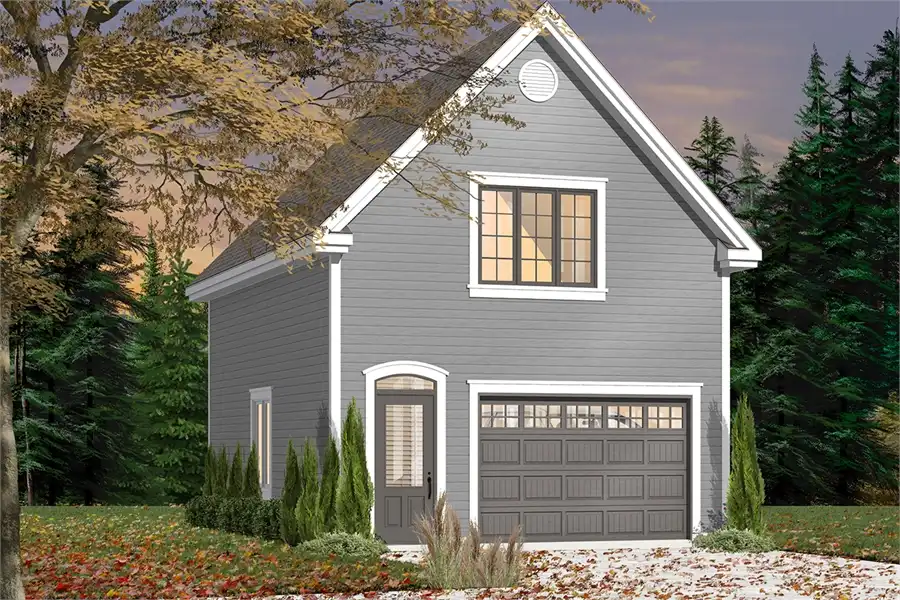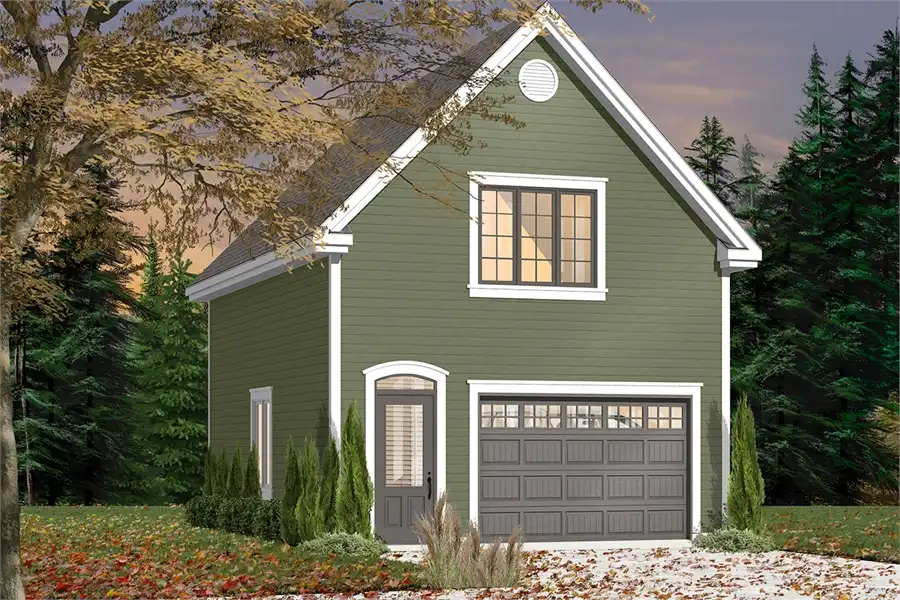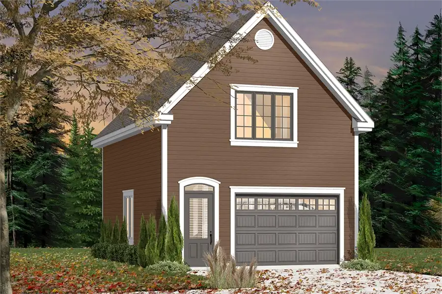 This attractive garage design incorporates an extra-long parking bay, plus an oversized workshop area. Upstairs, a versatile bonus room would make a great art studio or kids' playroom.