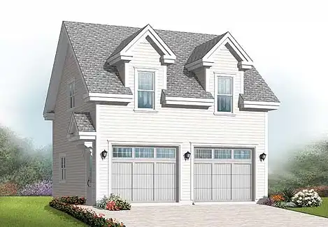 This lovely garage design has an old-fashioned appeal. Stairs lead up to a versatile bonus space, which could serve as a playroom or even a cozy apartment.