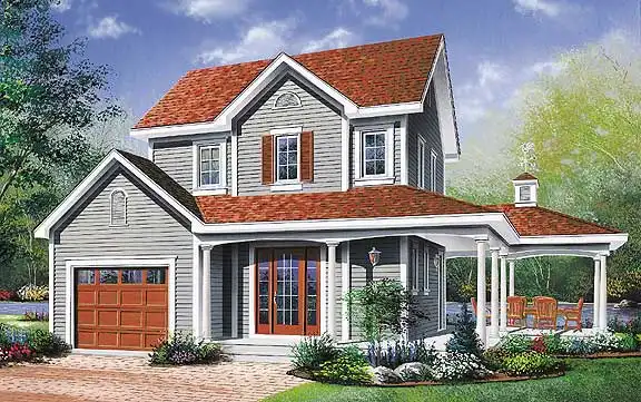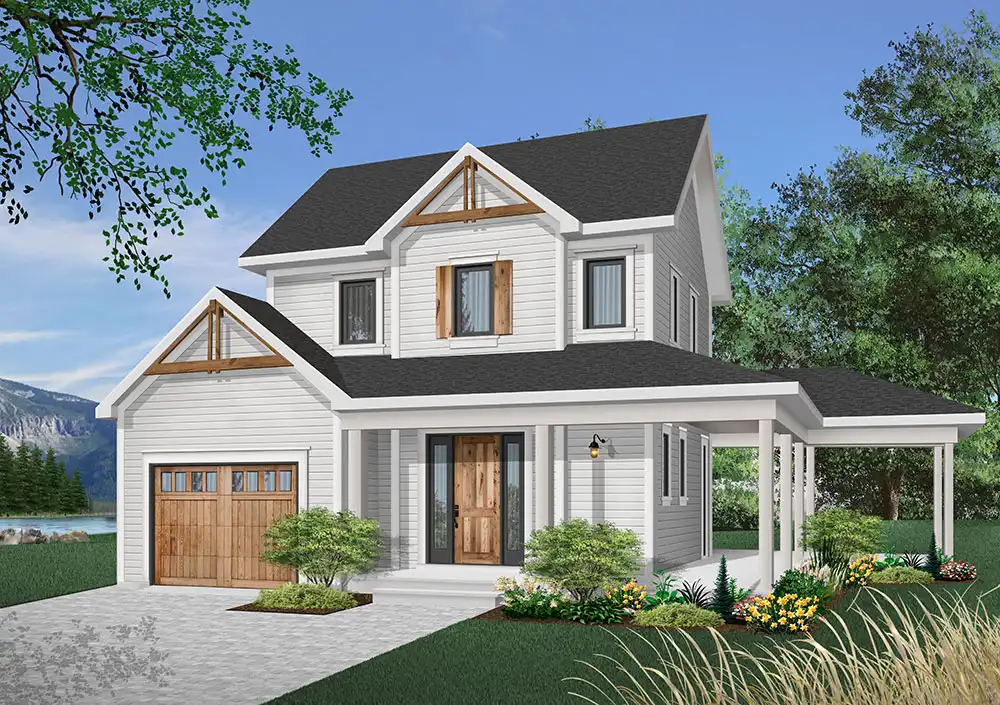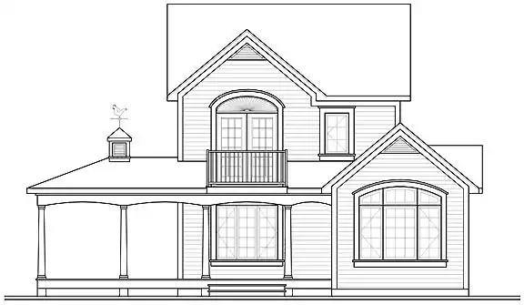 This farmhouse-inspired house plan would look great by a lake or in any town. A breezy porch embraces three sides of the home. Off the bright foyer, a powder room allows guests to freshen up after a long drive. The island kitchen serves any meal with ease. Note: This plan comes with two versions, and both are included with the blueprints. The two-bedroom version has a special area in the living room with a cathedral ceiling. If you choose three bedrooms, you will add 36 sq. ft. to the total living area. French doors in the master bedroom provide access to a refreshing outdoor balcony.