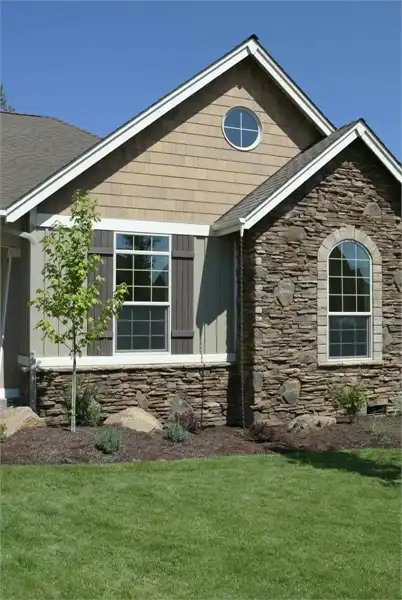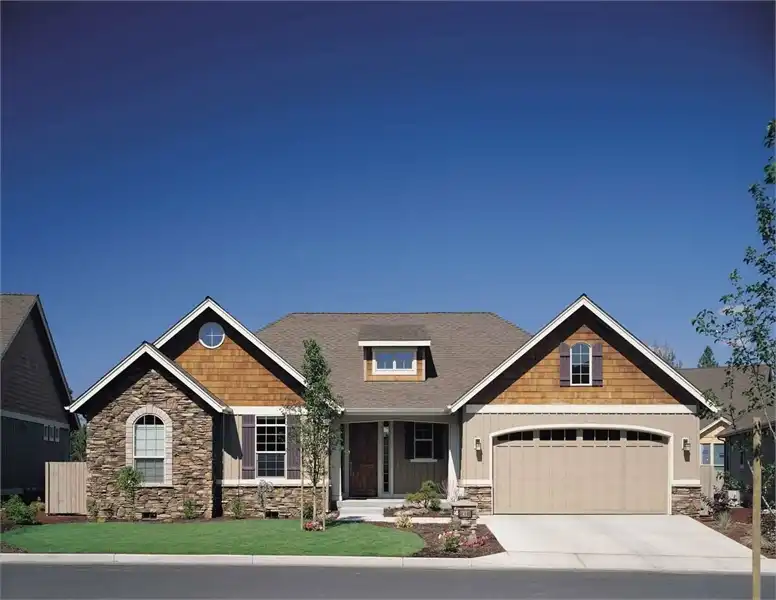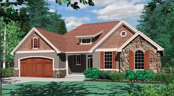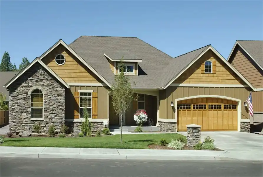 With a facade more inviting than those found on most home plans, this popular choice combines traditional design elements with multiple materials. At only 1,728 square feet, the floor plans offer a modest size, but with plenty of features. Inside, the open kitchen showcases a menu desk, an angled bar and a nearby pantry closet. The vaulted Great Room with fireplace hosts get-togethers in comfort. The master baths spa tub will soak your cares away. Have you found your perfect house plans?