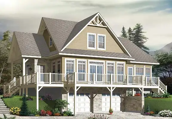 9' ceiling in the activity area and cathedral up to 15' in master suite. Fireplace shared between master suite and living room. Remarkable kitchen with walk-in pantry, two windows and 20' linear of counter. Master suite with private shower room and walk-in closet. Two nice bedrooms on 2nd level. Two-car garage in the basement with workshop-storage space nearby. Unobstructed views! If you are looking for a home to capture a view, this model is sure to please. Simple and elegant lines, abundant windows, a screened veranda and wraparound deck... These are only the exterior allures of this model. A further benefit is a front façade just as attractive as the rear thus allowing great flexibility for a wide variety of lot styles. Inside, a well-positioned staircase allows for panoramic views and casual access to the wraparound deck. The master bedroom is conveniently found on the main level adorned by a veranda access, a walk-in closet, master bathroom vualted ceiling and a two-sided fireplace which is shared with the family room. A guest bathroom and laundry complete the main level comforts. Upstairs, we find two bedrooms and a full bathroom as well as a computer or reading nook. The lower level includes a two-car garage with workshop and undeveloped spaces for additional bedrooms, office or media area.