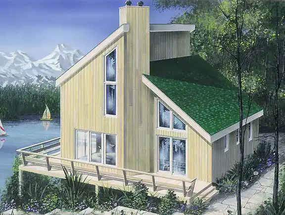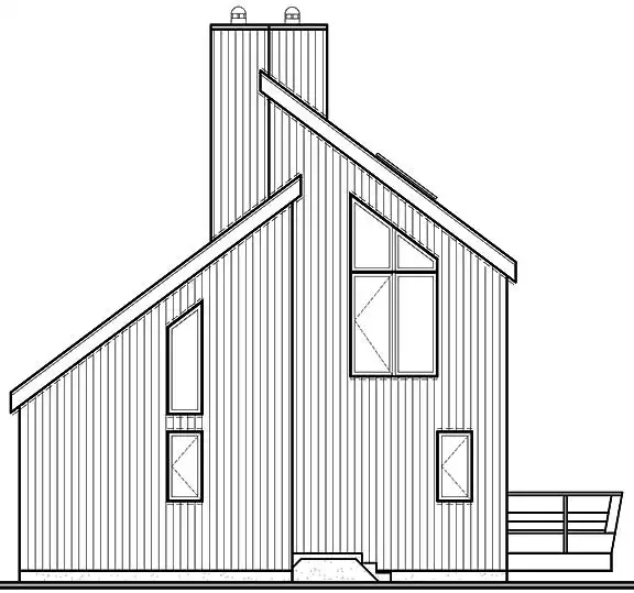 This contemporary house design offers a wraparound deck for plenty of outdoor relaxation. Near the main entry lie a storage room, a laundry room and a coat closet. The master bedroom is quiet and secluded. Friendly gathering may be hosted in the living room, where a woodstove is the focal point. The eat-in kitchen is efficient and hospitable. Two more bedrooms are found on the upper level, with a nice view to the level below.