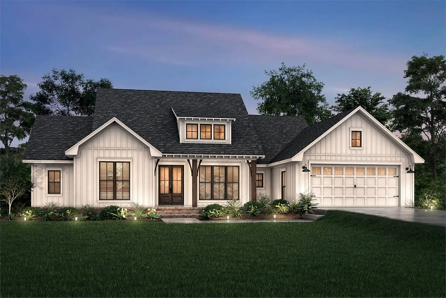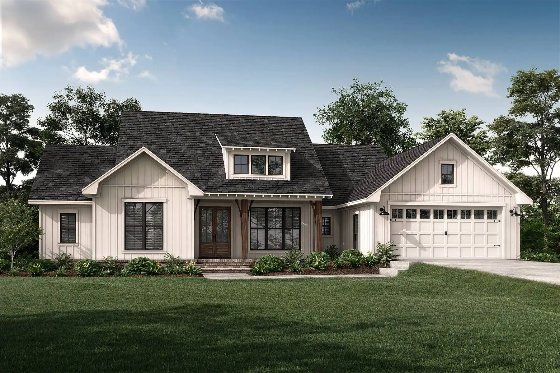 House Plan 4685 is a lovely one-story country home with 2,020 square feet, three bedrooms, and two-and-a-half bathrooms. Porches in front and back help complete the classic farmhouse look, but the interior layout is everything a modern family wants. Open-concept living fills out the center of the floor plan, with dining space in front and the island kitchen open to the living area in back. The bedrooms are split around this for privacy. The primary bedroom is in the hallway with the laundry room and garage entrance, and it boasts a five-piece bath and a walk-in closet. The other two bedrooms are clear on the other side of the house and share a four-piece hall bath.