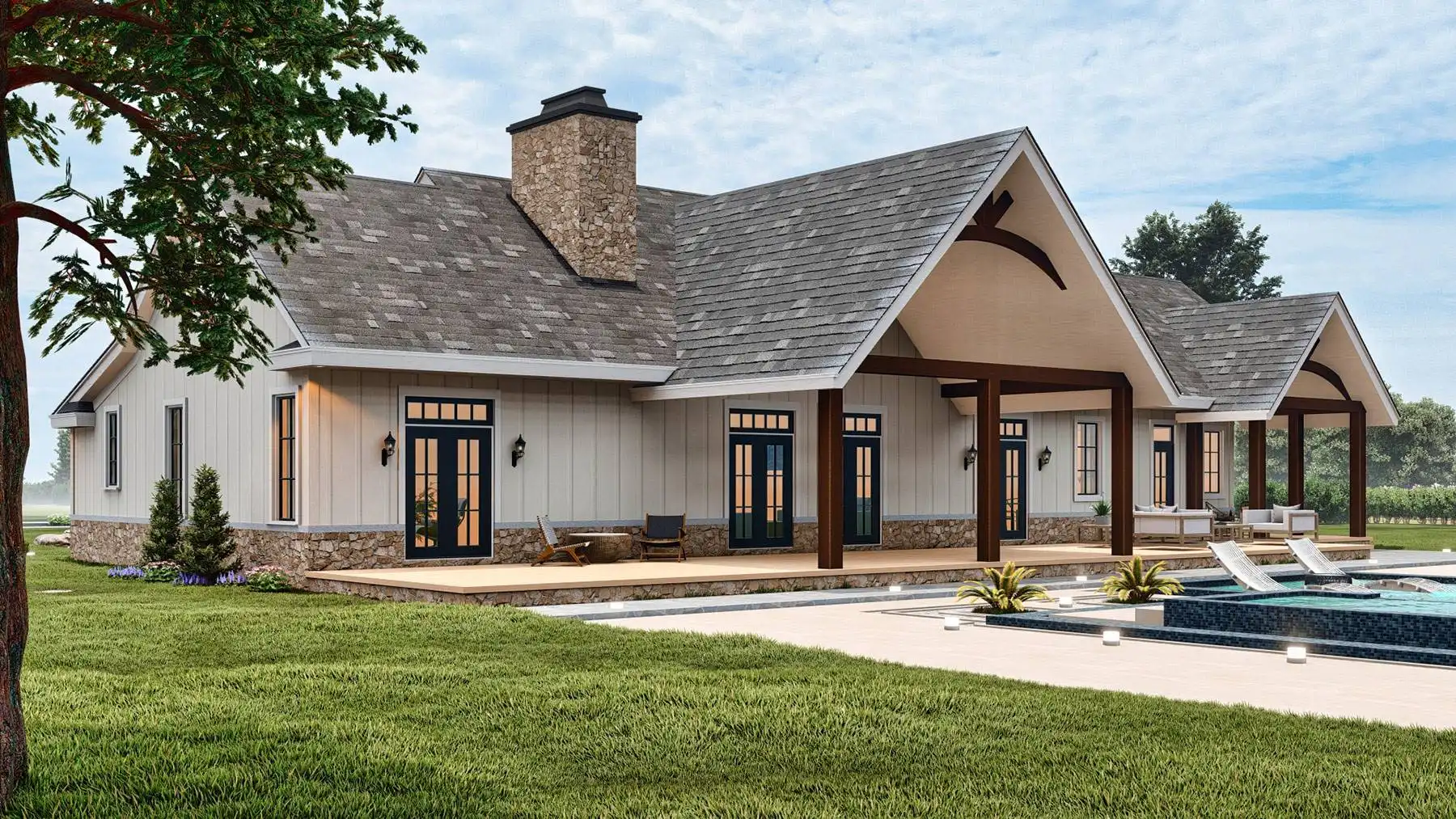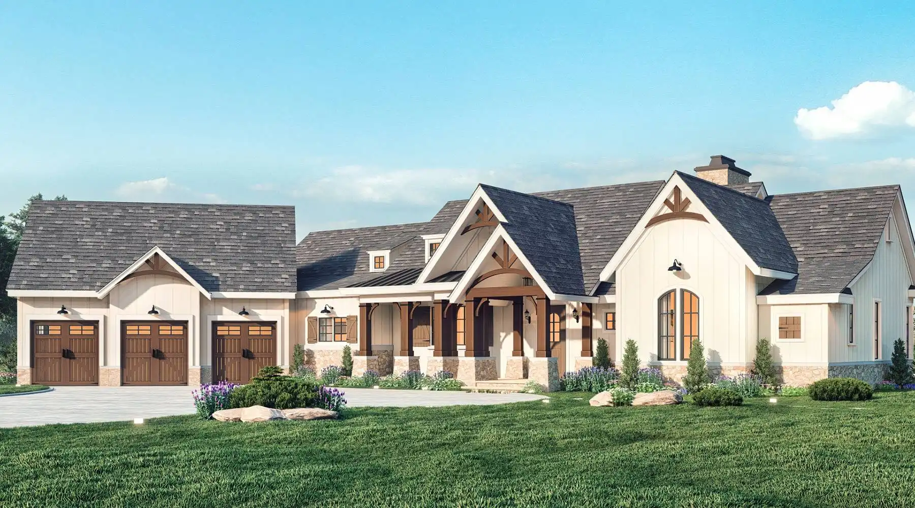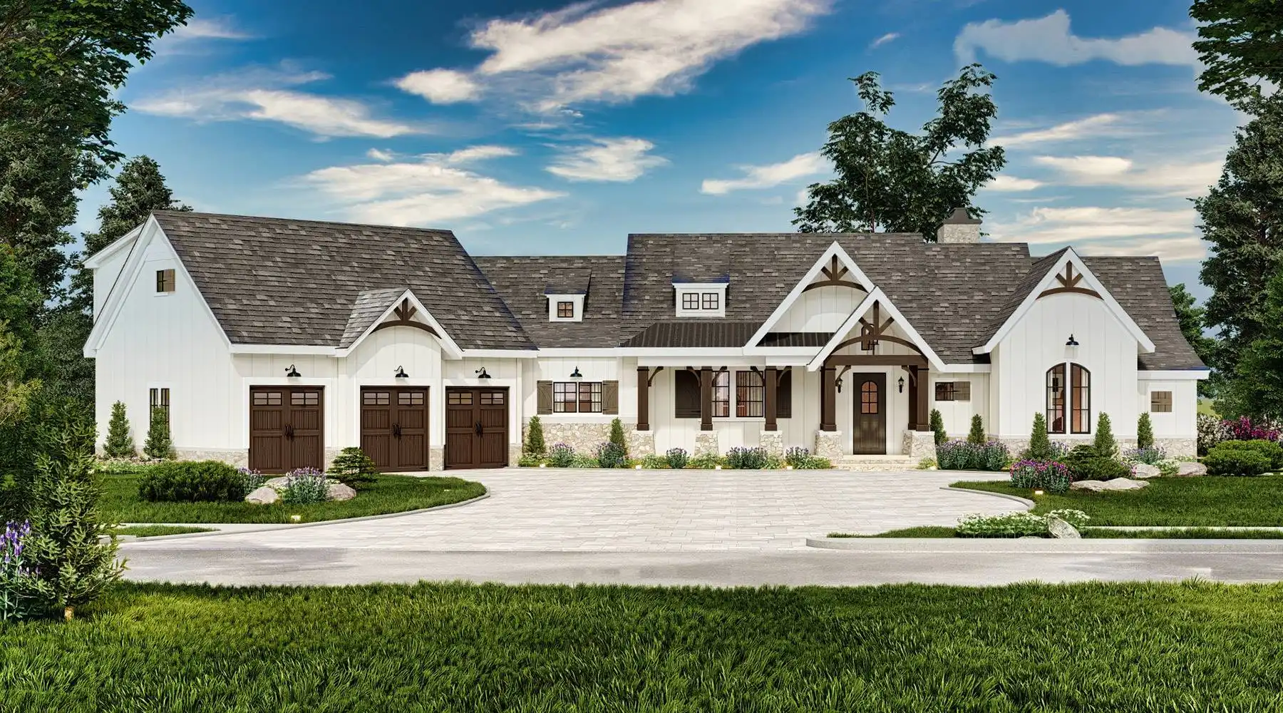 House Plan 4686 is a wonderful ranch made for taking in rear views, so give it your consideration if you're building near a lake or on acreage! This 2,537-square-foot design has 3 bedrooms and 2.5 bathrooms in a thoughtful layout that checks the boxes for today's families. First up, there's a powder room directly off the foyer. Step inside and the open living spaces are comprised of the two-story great room, dining area, and the U-shaped island kitchen. A gallery hallway connects the whole house and places the luxurious master suite on one end and the other two bedrooms and their bathroom on the other. If you need more space than this, just imagine what you could do with the bonuses upstairs. House Plan 4686 delivers what so many people are looking for and the chance to finish additional spaces to their own exact specifications!