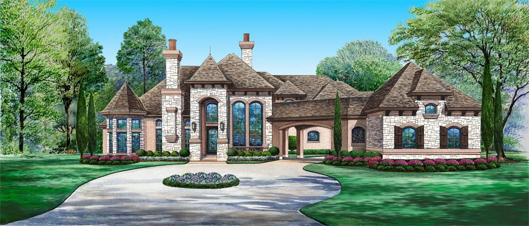 This eye-catching house design offers a traditional feel. Two double garages flank a spacious motor court. Inside, the living and dining rooms share a see-through fireplace. A quiet study flows into a curved reading room. A door opens to the master wardrobe, and in turn to the deluxe bath. The gourmet kitchen serves several rooms with ease. A nearby wine room is centrally located. Watch a favorite movie in the media room, which boasts a refreshing bar. A corner bedroom would be perfect for in-laws. Upstairs, a game room, an office and a bonus room would be great places for hobbies, homework and relaxation.