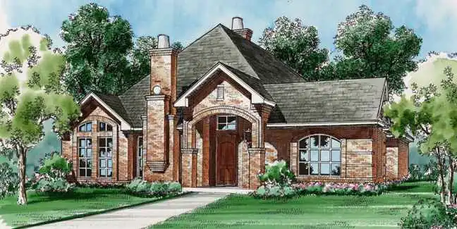 This beautiful brick home design will be a standout in any neighborhood. Dramatic vaulted ceilings are found in most rooms of the home. Fireplaces add warmth to the formal living room and the casual family room. The secluded study would make a great home office. The island kitchen is perfectly situated to serve both the dining room and the breakfast area. A luxurious bath is the highlight of the master suite, which lies in a private corner of the home. Near the two-car garage, two secondary bedrooms share a hall bath. Laundry facilities are conveniently located near the bedrooms.