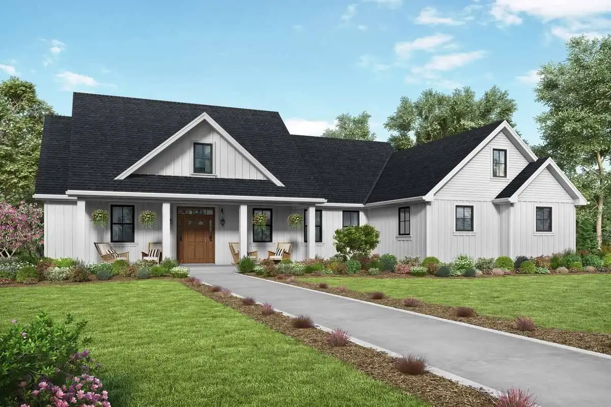 Southern Charm in an unmistakably attractive farmhouse-style design, this 2,104 square foot ranch plan is super inviting and comfortable. The interior is accessible and spacious, as the auxiliary bedrooms on the left by the garage, join with the master bed and bath on the right, via the impressive living room and dining room combination. Plus, the gourmet kitchen nearby is perfect for entertaining crowds both large and small. Notice how the living room is lined with beautiful French doors which open onto the rear porch and are great for letting in a cool summer's breeze. Finally, move above the garage to discover a great bonus room/flex space, perfect for so many different uses!