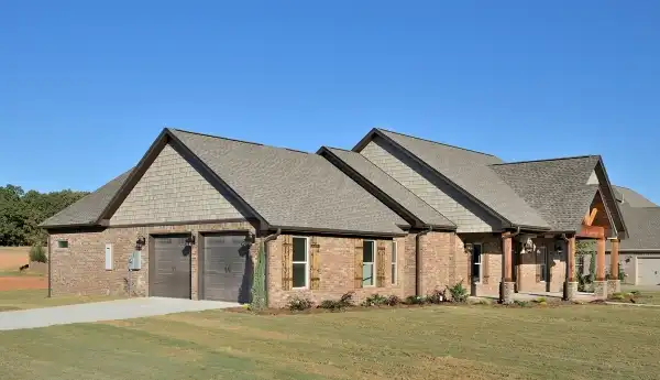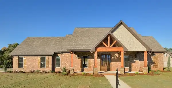 The open concept of the main living areas of this floor plan is great for entertaining and the home appears super spacious. The open kitchen shows off an island with a curved snack bar. There are two pantries, one in the kitchen and one in the utility room. The living room features a striking stone corner fireplace and a built-in entertainment center. Two sizable bedrooms with a jack and jill bath are great for the kids. This medium-size home boasts a private his and her bath off the master suite. Both baths have walk-in closets and hers also has a place for shoes. The shower is the only feature that is shared between the two baths. The spacious sleeping chamber is topped by an elegant step ceiling.