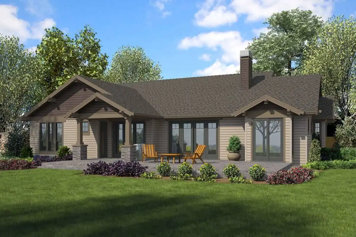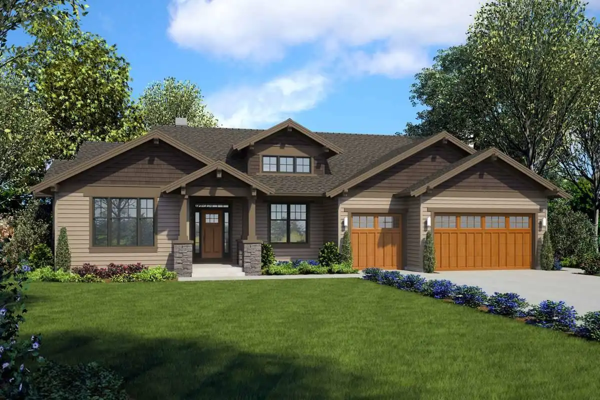 An amazingly comfortable ranch-style layout adds a bit of accessibility to this impressive Craftsman-style plan. 2,791 square feet of living space provides 3 large bedrooms, each with their own private bathroom! This includes a fully private guest suite which sits beyond the 3-car garage, even offering its own living room and private porch. The master bed and bath sits off of the large living room, with the island kitchen and dining room nearby. You'll also notice the final bedroom suite as well as a private office, both of which are off of th main foyer.
