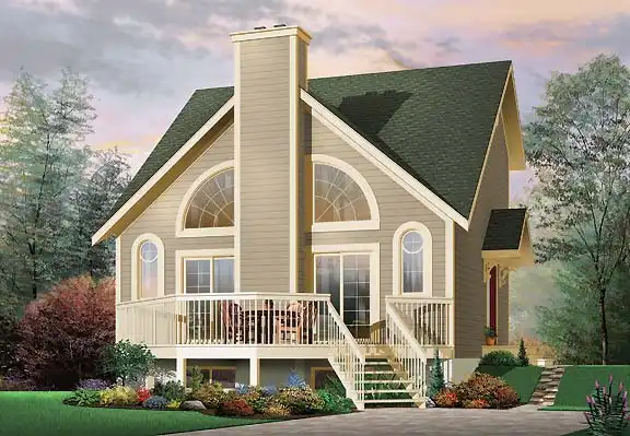 This getaway house plan offers plenty of glass for scenic views. Inside, a central fireplace warms the family and dining rooms. The island kitchen is extremely open. On the upper floor, the master suite is spacious and relaxing. Glass walls bring in the views.