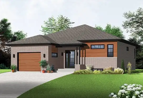 The sleek look of this one-story house plan will draw compliments from neighbors and passersby. The open kitchen incorporates an island snack bar. The versatile dining room includes backyard views. The living room is perfect for good conversation. A full bath serves the two bedrooms. A handy laundry closet is nearby. Remember that the basement effectively doubles your space. Perhaps you will use it for storage or extra sleeping space.
